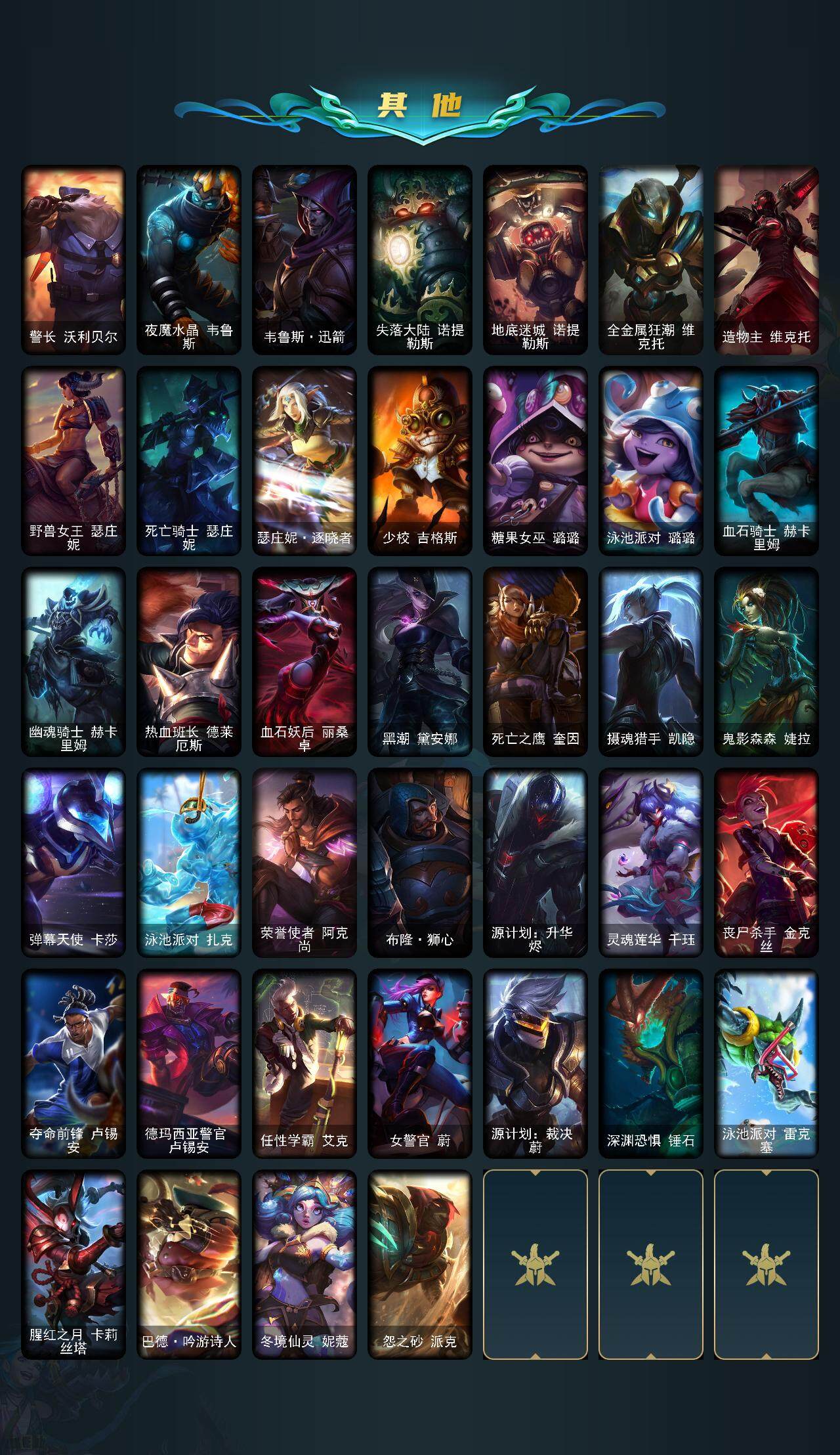 【冰雪限定】:幸福女神乐芙兰,圣诞开心鬼提莫,圣诞精灵崔丝塔娜,圣诞狂欢努努和威朗普,圣诞狂欢基兰,阿木木“主人不要我了”,胡桃夹子萨科,平安夜女神娑娜,邪恶圣诞老人维迦,喜庆之树茂凯,冬季仙境奥莉安娜,雪默丁格,圣诞玩偶波比,圣诞老人古拉加斯,圣诞驯鹿克格莫,魄罗骑士瑟庄妮,雪球也能爆炸吉格斯,冰雪节辛吉德,冰雪节玛尔扎哈,冰雪节格雷福斯,冰雪女神辛德拉,冰雪兽纳尔