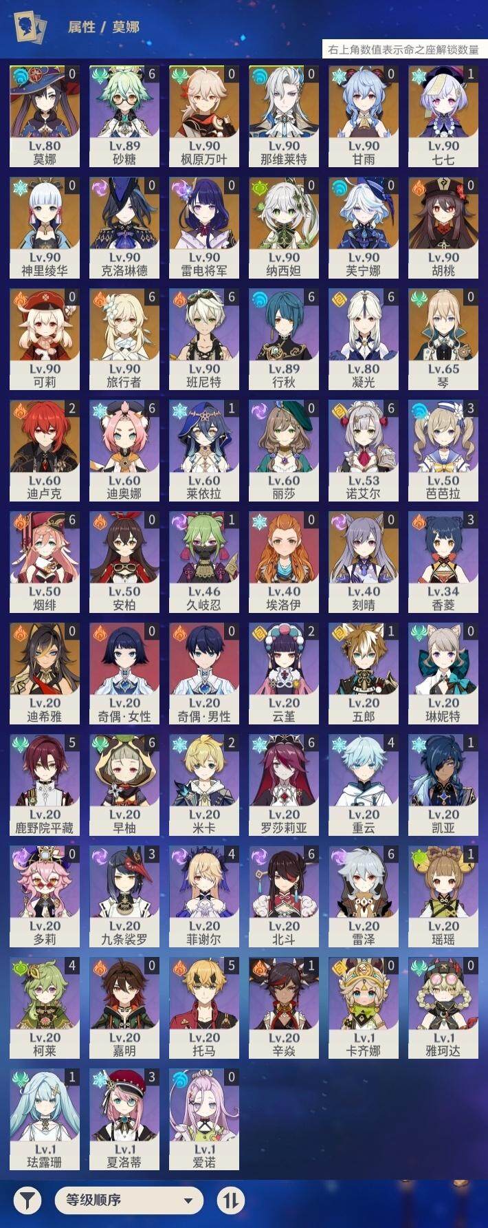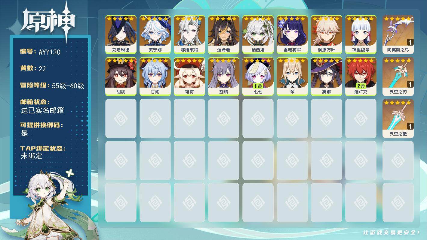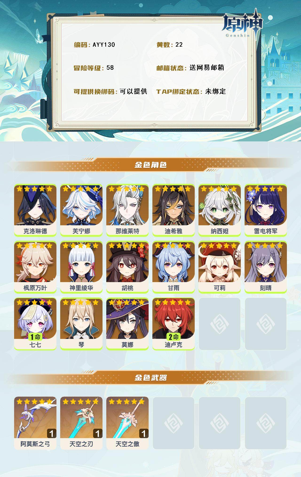 [15259879]58级/22黄/女主/16个五星角色/3个五星武器 0命克洛琳德,0命芙宁娜,0命那维莱特,0命迪希雅,0命纳西妲,0命雷电将军,0命枫原万叶,0命神里绫华,0命胡桃,0命甘雨,0命可莉,0命刻晴,1命七七,0命琴,0命莫娜,2命迪卢克,精1阿莫斯之弓,精1天空之刃,精1天空之傲