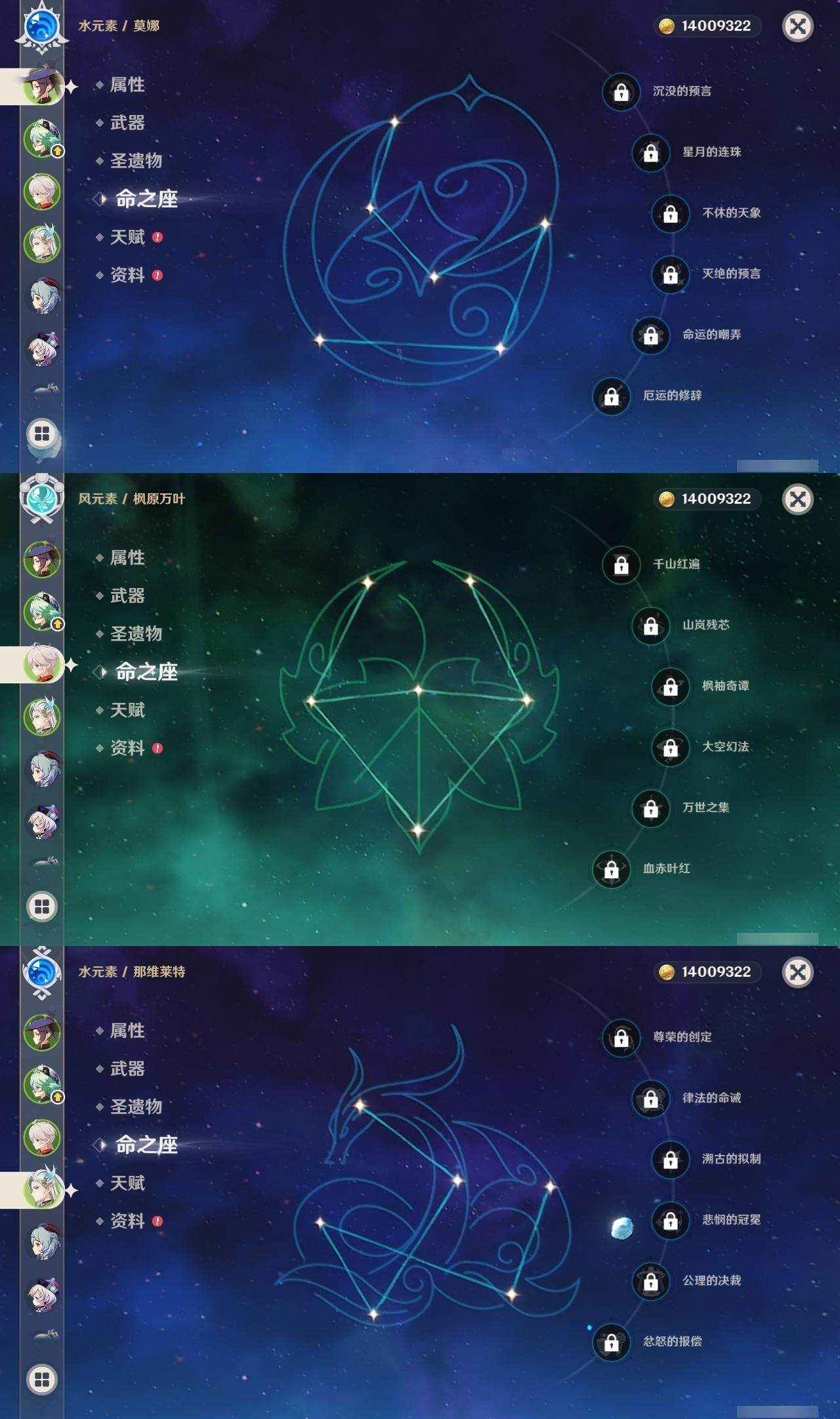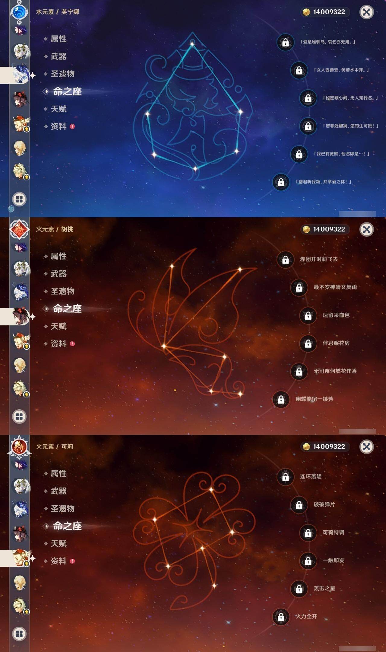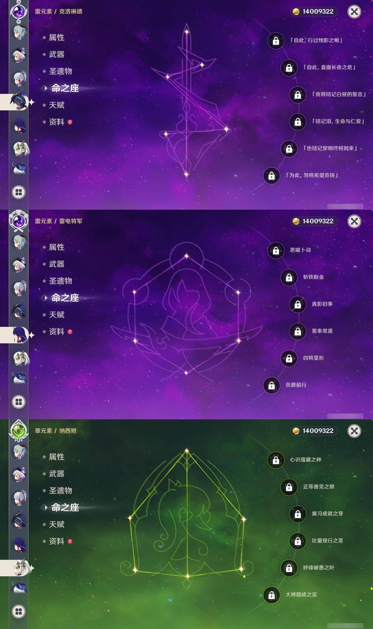 [15259879]58级/22黄/女主/16个五星角色/3个五星武器 0命克洛琳德,0命芙宁娜,0命那维莱特,0命迪希雅,0命纳西妲,0命雷电将军,0命枫原万叶,0命神里绫华,0命胡桃,0命甘雨,0命可莉,0命刻晴,1命七七,0命琴,0命莫娜,2命迪卢克,精1阿莫斯之弓,精1天空之刃,精1天空之傲
