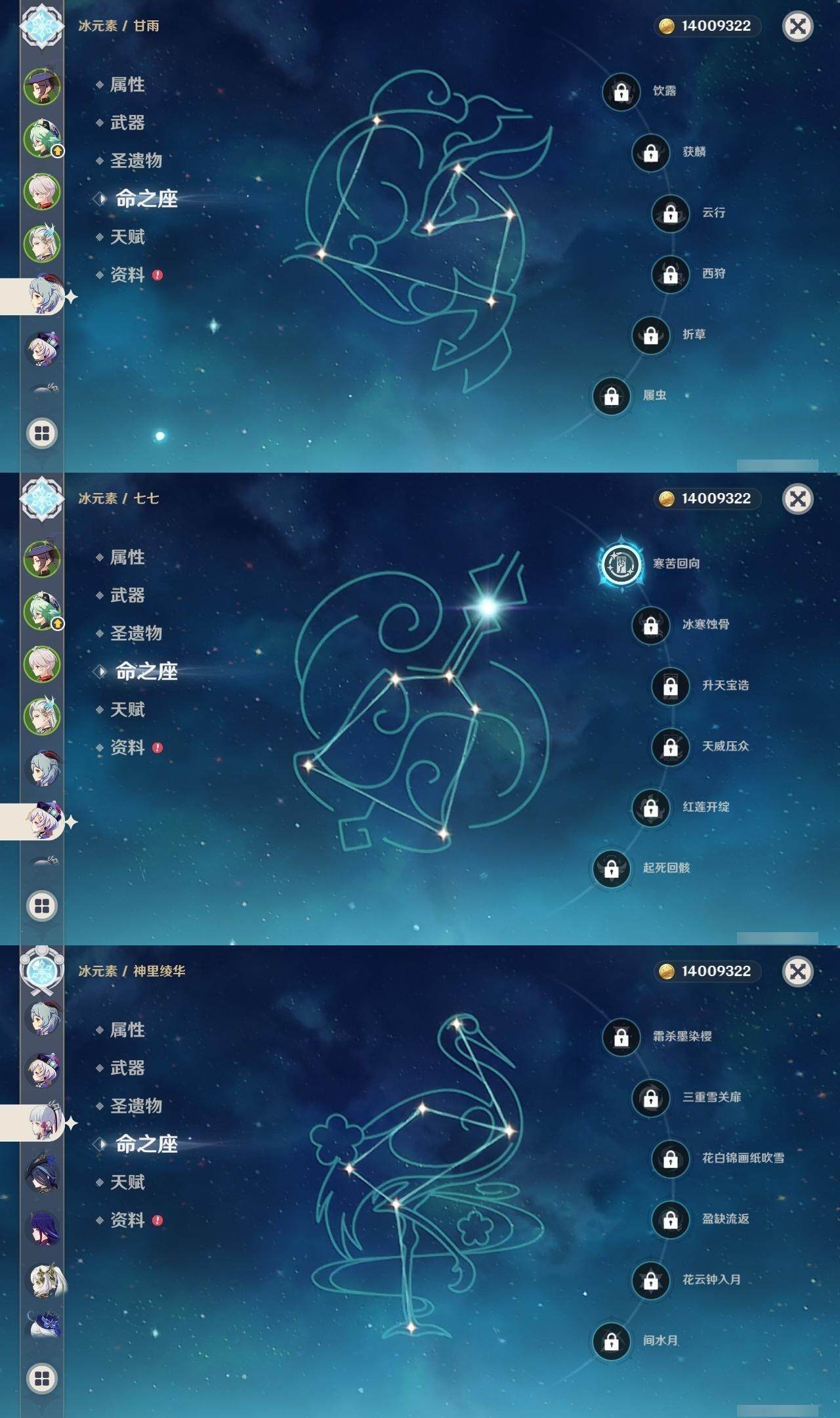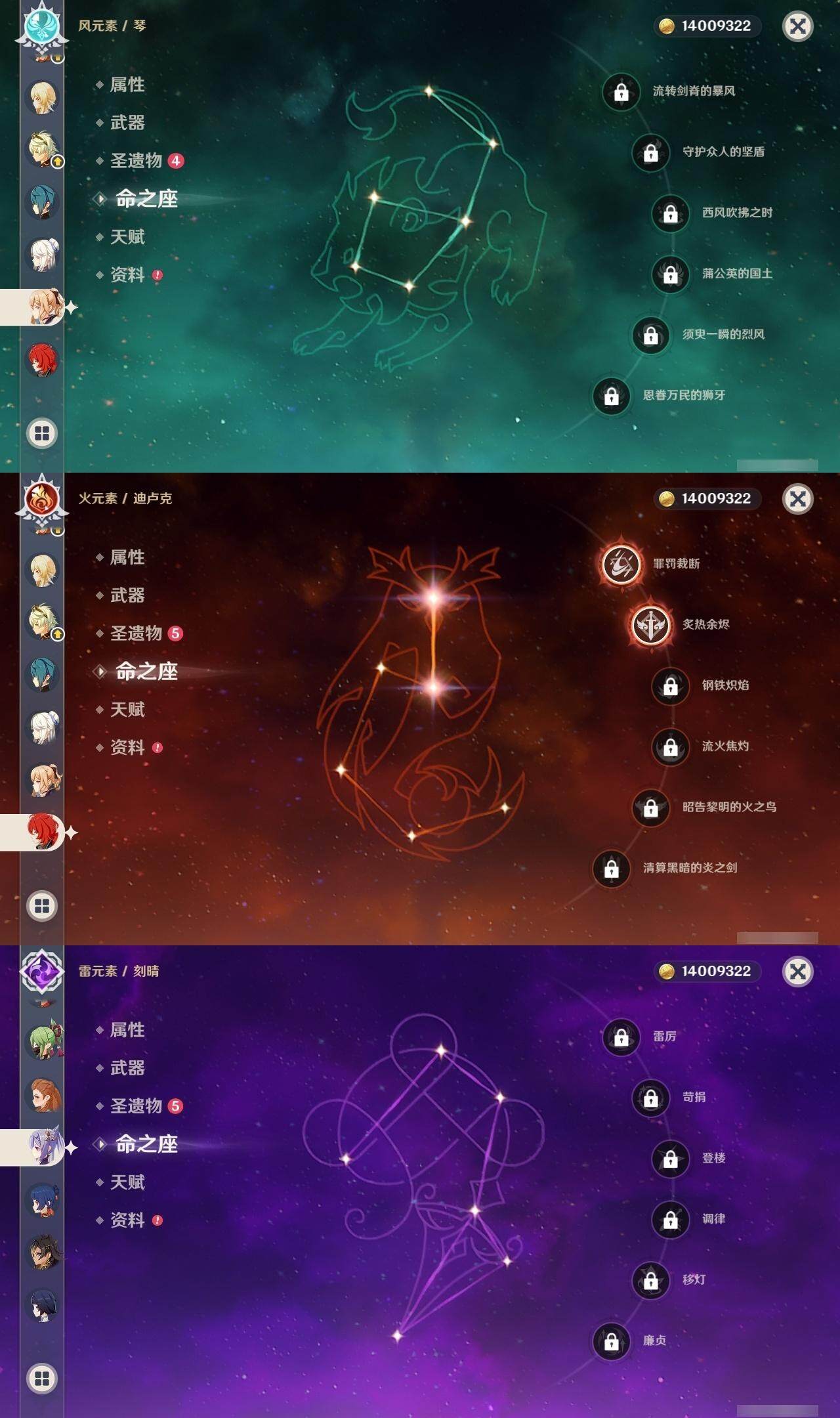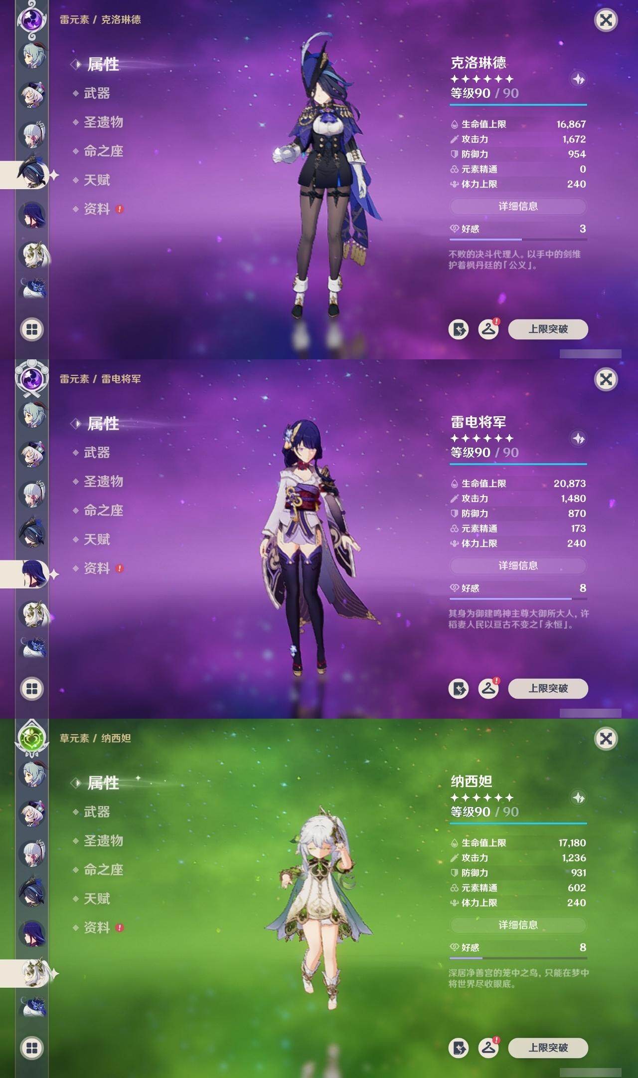 0命克洛琳德,0命芙宁娜,0命那维莱特,0命迪希雅,0命纳西妲,0命雷电将军,0命枫原万叶,0命神里绫华,0命胡桃,0命甘雨,0命可莉,0命刻晴,1命七七,0命琴,0命莫娜,2命迪卢克,精1阿莫斯之弓,精1天空之刃,精1天空之傲