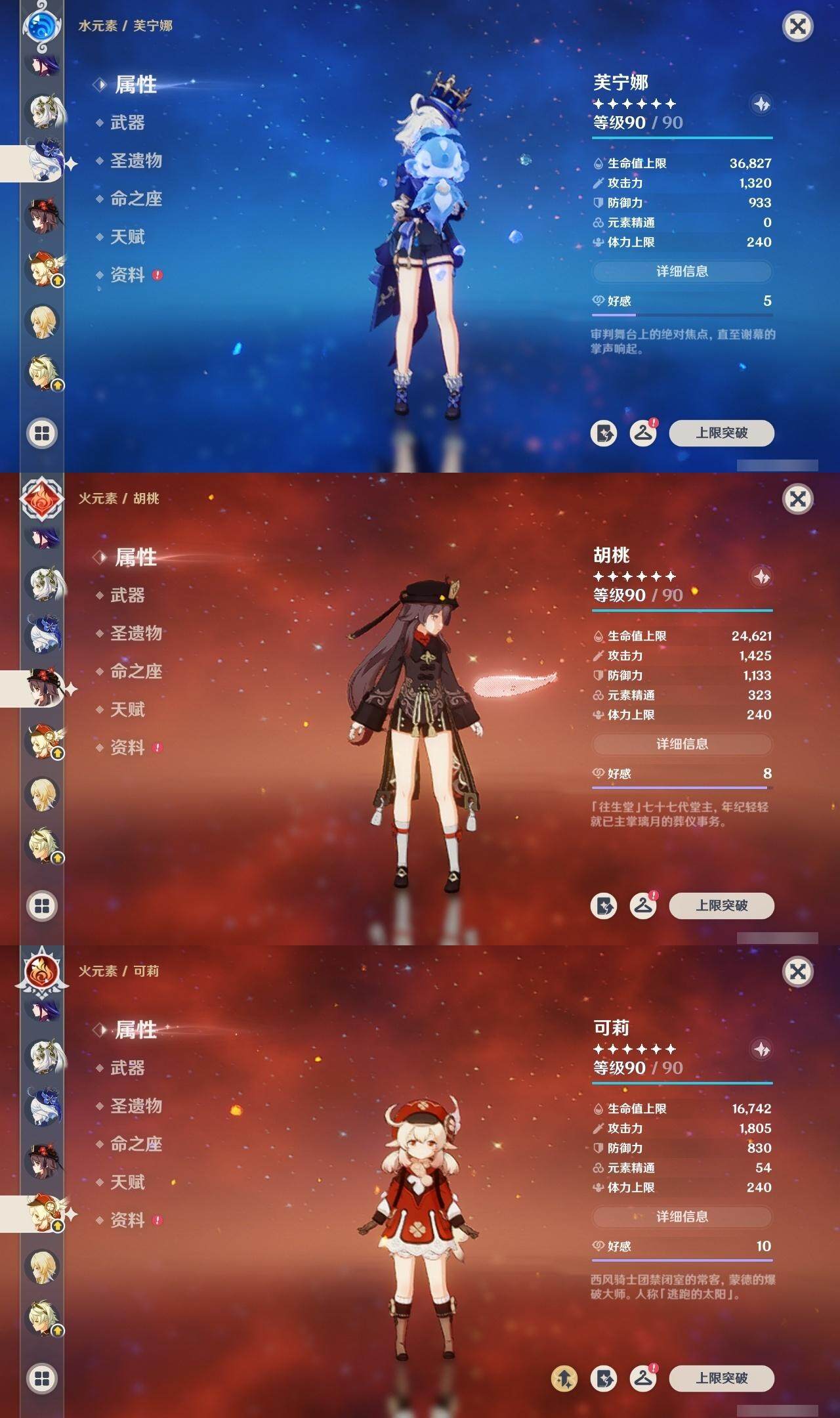 莫娜,枫原万叶,甘雨,七七,神里凌华,雷电将军,胡桃,可莉,琴,迪卢克,刻晴