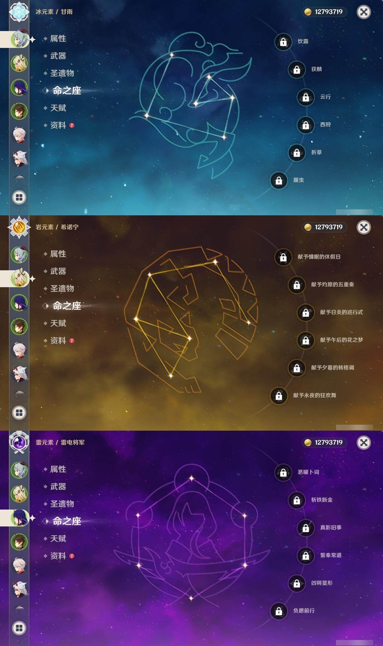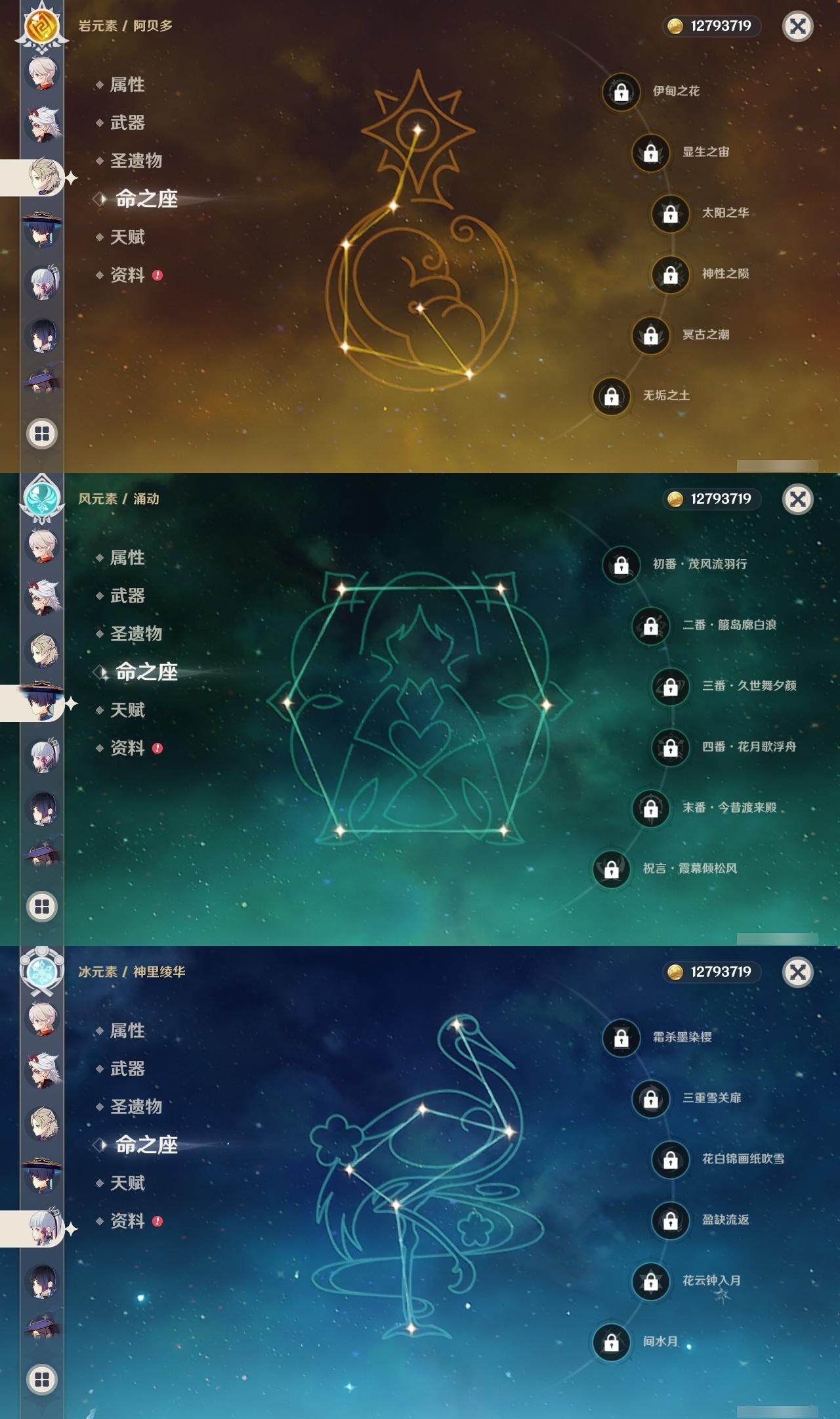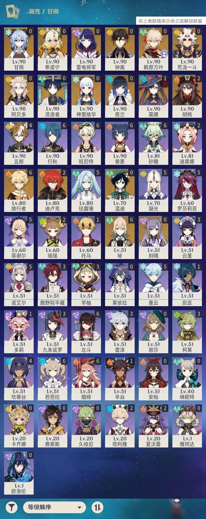 0命流浪者,0命夜兰,0命荒泷一斗,0命雷电将军,0命枫原万叶,0命神里绫华,0命钟离,2命胡桃,0命甘雨,0命温迪,0命阿贝多,0命刻晴,满命琴,1命莫娜,2命迪卢克,0命希诺宁,精1赤角石溃杵,精1天空之脊,精1阿莫斯之弓,精1天空之刃