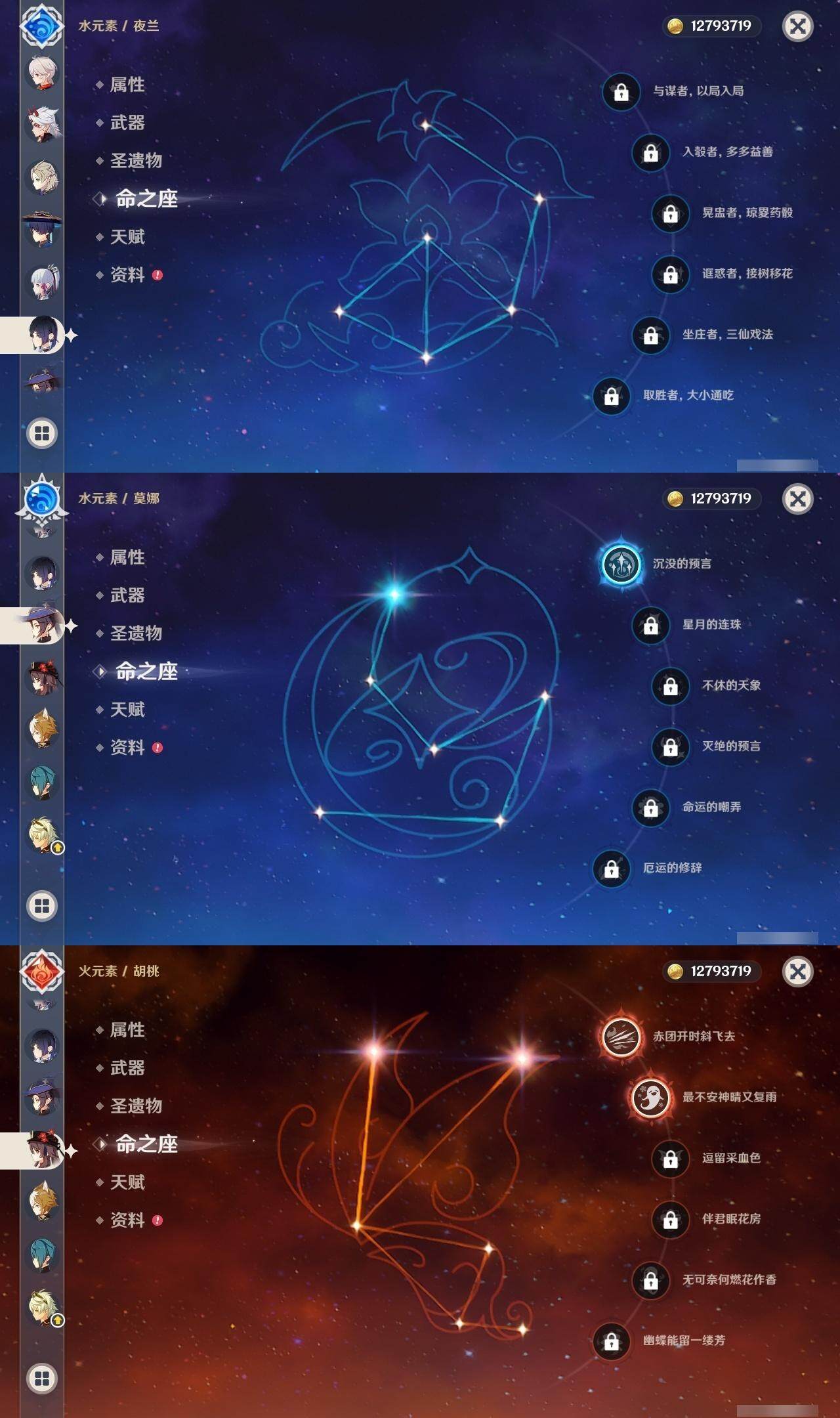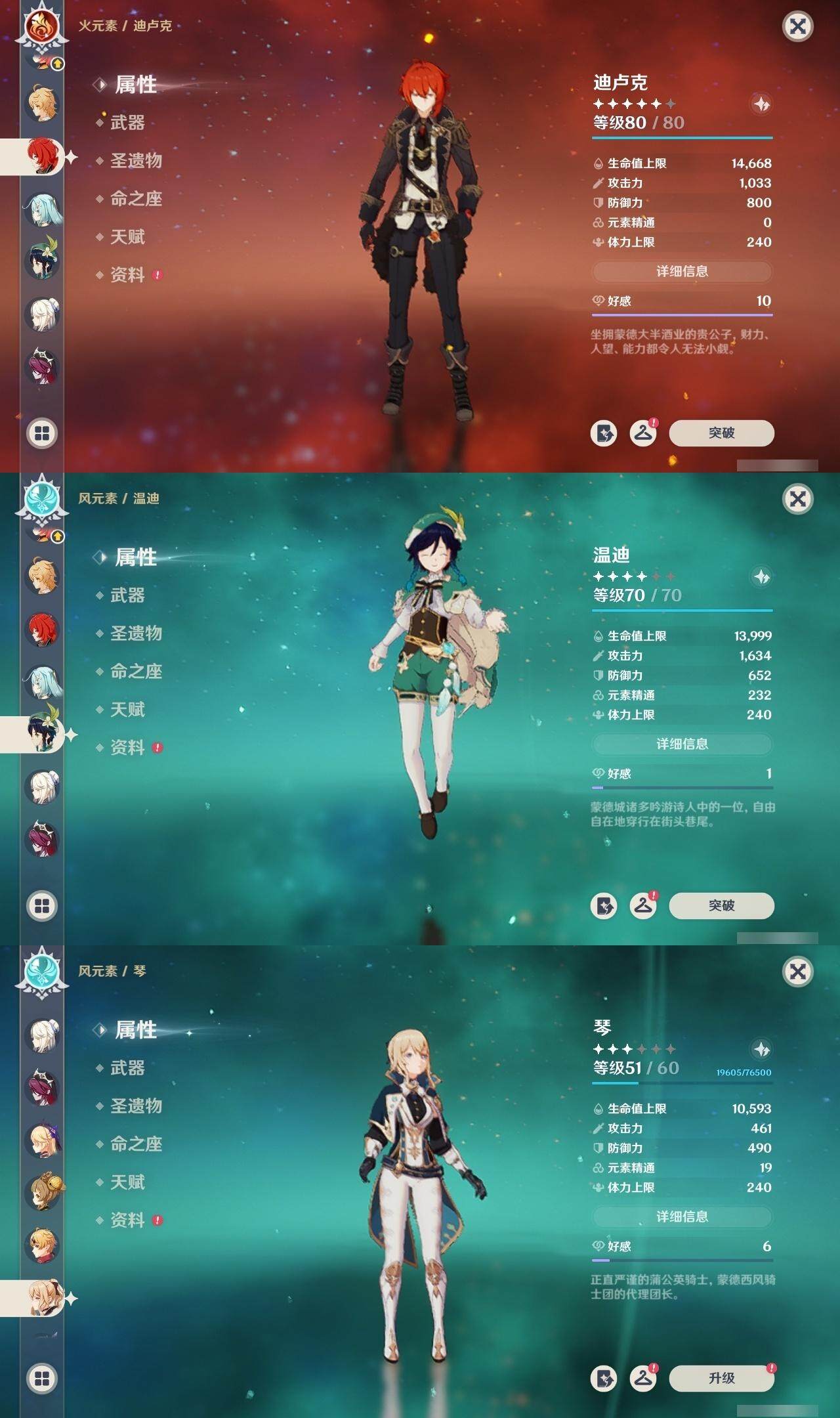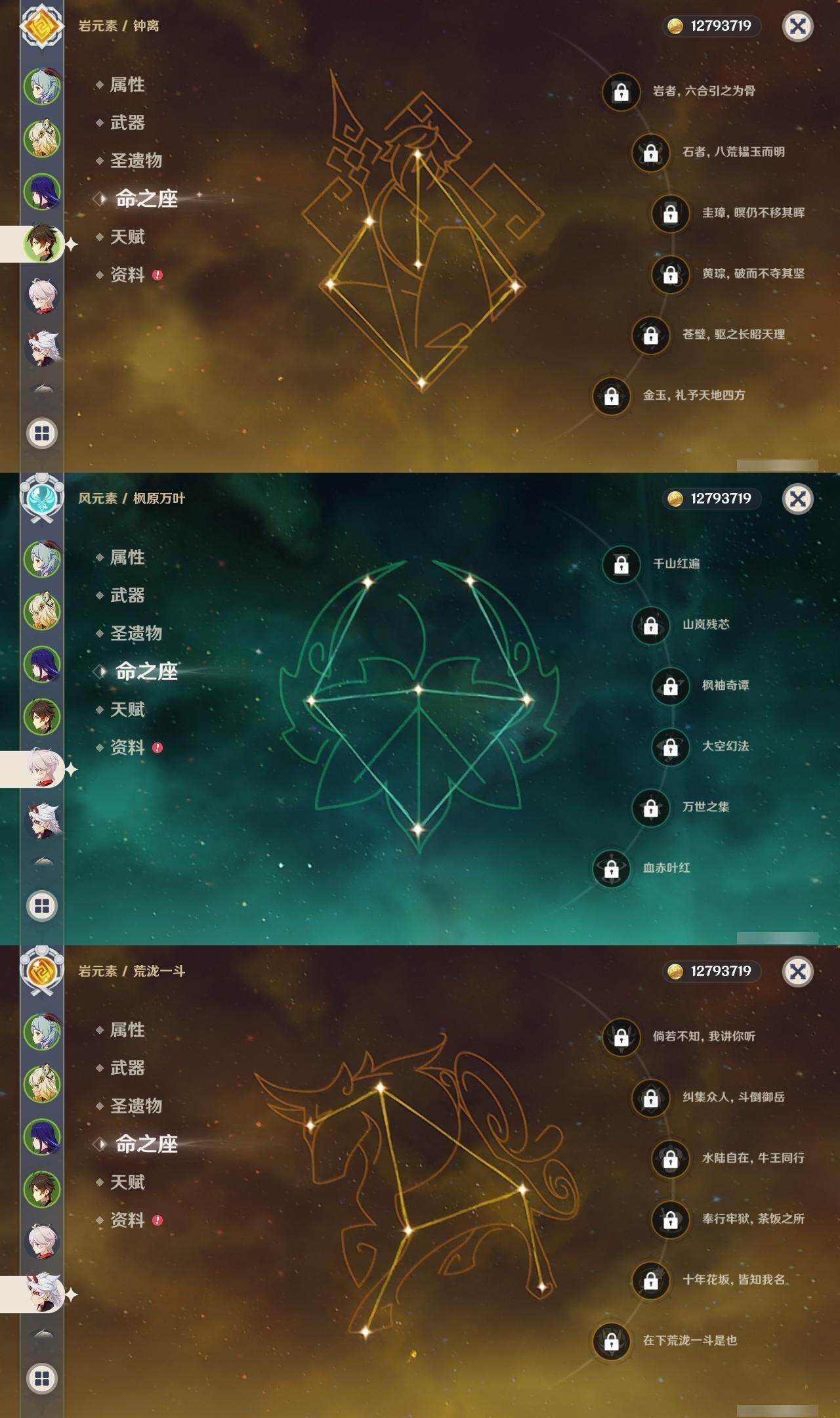 0命流浪者,0命夜兰,0命荒泷一斗,0命雷电将军,0命枫原万叶,0命神里绫华,0命钟离,2命胡桃,0命甘雨,0命温迪,0命阿贝多,0命刻晴,满命琴,1命莫娜,2命迪卢克,0命希诺宁,精1赤角石溃杵,精1天空之脊,精1阿莫斯之弓,精1天空之刃
