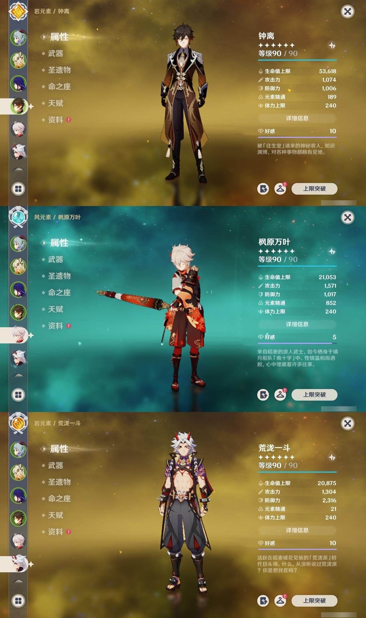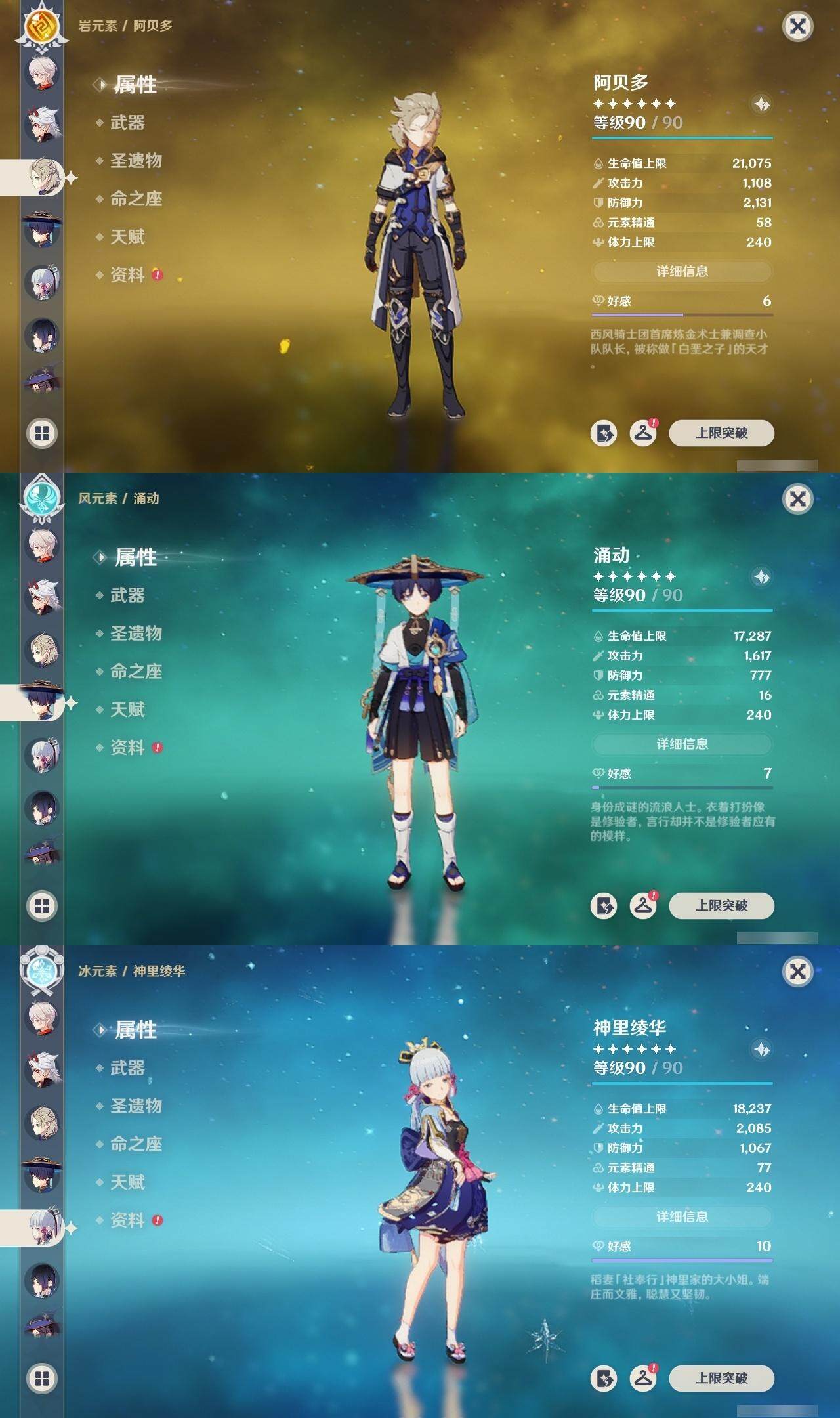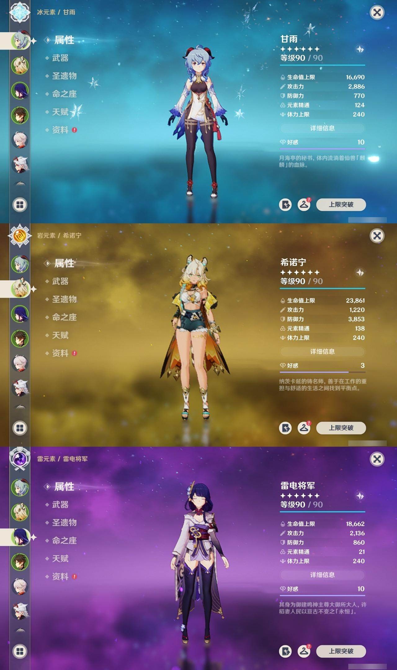 甘雨,雷电将军,钟离,枫原万叶,荒泷一斗,阿贝多,神里凌华,莫娜,胡桃,迪卢克,温迪,琴,刻晴