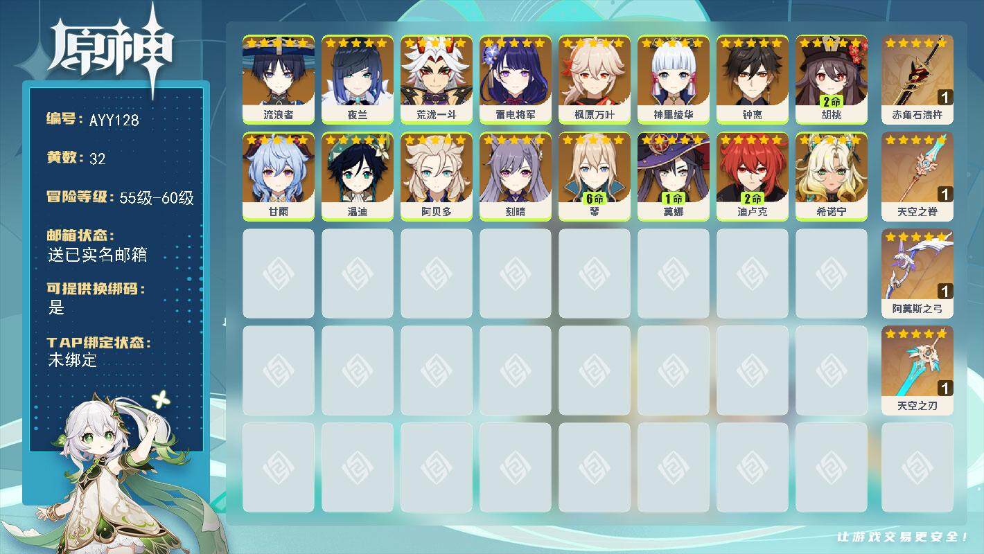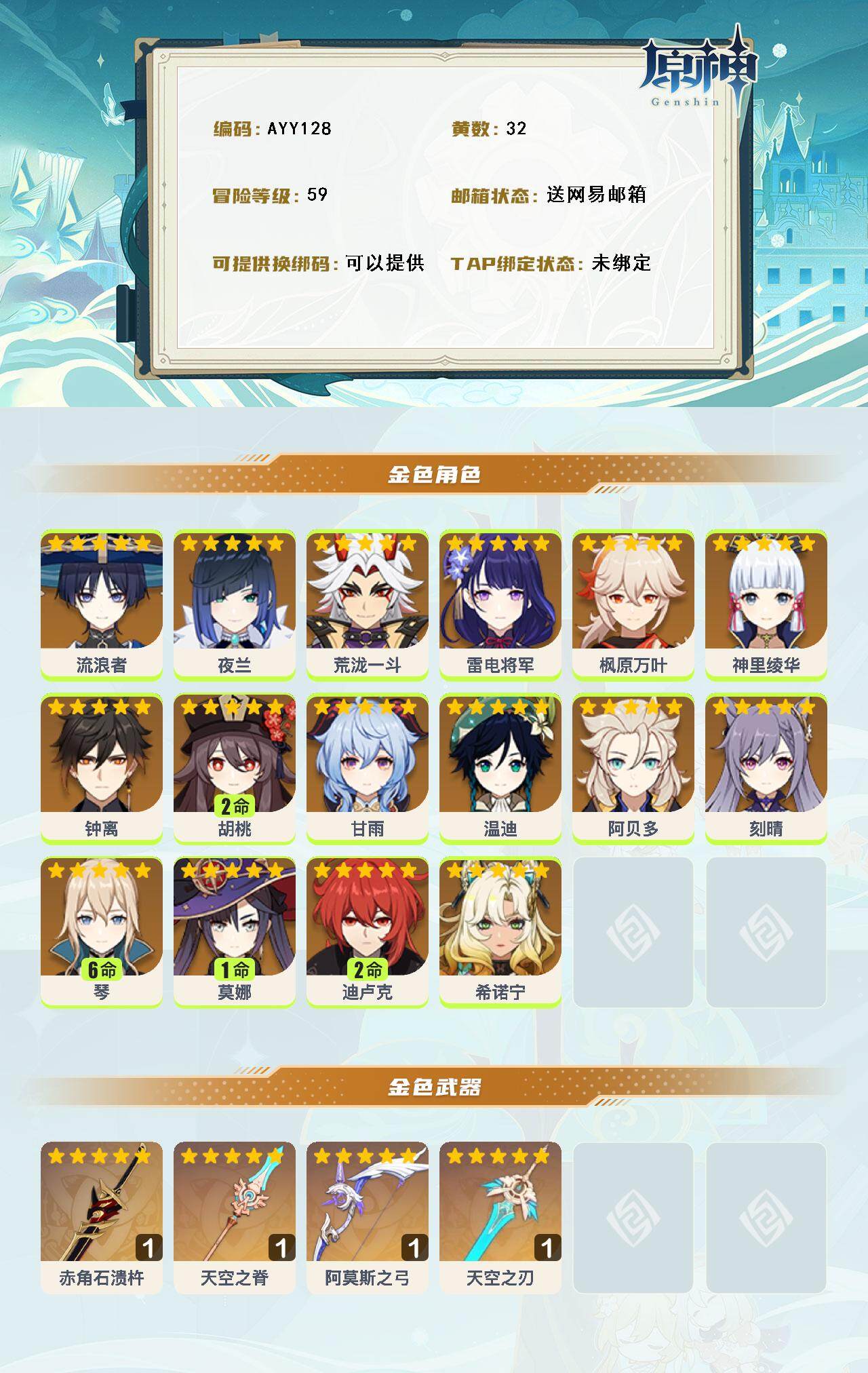 [15260130]59级/32黄/男主/16个五星角色/5个五星武器 0命流浪者,0命夜兰,0命荒泷一斗,0命雷电将军,0命枫原万叶,0命神里绫华,0命钟离,2命胡桃,0命甘雨,0命温迪,0命阿贝多,0命刻晴,满命琴,1命莫娜,2命迪卢克,0命希诺宁,精1赤角石溃杵,精1天空之脊,精1阿莫斯之弓,精1天空之刃