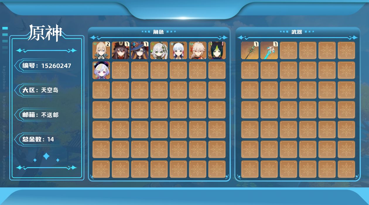 0命纳西妲,0命提纳里,0命枫原万叶,0命神里绫华,1命胡桃,0命七七,2命琴,1命莫娜,精1和璞鸢,精1天空之刃