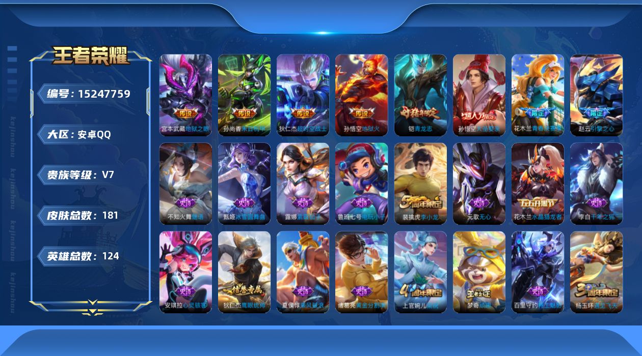 [15247759]暑期末清货/特价急出/永久包赔安卓Q-V7-永恒钻石II段位-124英雄-181皮肤-4传说-41史诗 【内测皮肤】:高渐离玩趣恶龙,狂铁特工战影 【传说皮肤】:狄仁杰超时空战士,孙悟空地狱火,宫本武藏地狱之眼,孙尚香末日机甲 【限定皮肤】:姜子牙天穹之誓,狄仁杰阴阳师,虞姬凯尔特女王,赵云皇家上将,赵云引擎之心,嬴政白昼王子,庄周高山流水,高渐离玩趣恶龙,吕布猎兽之王,元歌无心,夏侯惇朔风刀,甄姬游园惊梦,典韦穷奇,狄仁杰魔术师,狄仁杰万华元夜,达摩沙漠行僧,项羽海滩派对,老夫子醍醐杖,程咬金演武夺筹,兰陵王金庭之子,花木兰青春决赛季,孙悟空大圣娶亲,牛魔御旌,李元芳云中旅人,钟馗驱傩正仪,杨玉环遇见飞天,鬼谷子原初探秘者,铠青龙志,苏烈千军破阵,弈星混沌棋,梦奇顽趣,沈梦溪大漠名商,明世隐疑决卦,裴擒虎李小龙,裴擒虎擒涛扼浪,狂铁御狮,米莱狄御霄,盾山御銮,上官婉儿梁祝,鲁班大师探海日志,桑启海盐诗旅,阿古朵江河有灵,张良古海寻踪,蒙恬荣光圣徽,鬼谷子天穹祈灯,刘邦剑破天穹,程咬金群星魔术团,周瑜熔金海岸 【年限皮肤】:铠青龙志 【赛季限定】:夏侯惇朔风刀,典韦穷奇,狄仁杰万华元夜,达摩沙漠行僧,老夫子醍醐杖,程咬金演武夺筹,兰陵王金庭之子,张良古海寻踪,牛魔御旌,李元芳云中旅人,虞姬凯尔特女王,钟馗驱傩正仪,鬼谷子原初探秘者,苏烈千军破阵,弈星混沌棋,梦奇顽趣,沈梦溪大漠名商,明世隐疑决卦,裴擒虎擒涛扼浪,狂铁御狮,米莱狄御霄,盾山御銮,鲁班大师探海日志,桑启海盐诗旅,鬼谷子天穹祈灯,蒙恬荣光圣徽,刘邦剑破天穹,姜子牙天穹之誓 【战令限定】:嬴政白昼王子,吕布猎兽之王 【史诗皮肤】:鲁班七号电玩小子,露娜紫霞仙子,赵云皇家上将,貂蝉圣诞恋歌,甄姬冰雪圆舞曲,狄仁杰魔术师,宫本武藏鬼剑武藏,孙尚香水果甜心,妲己魅力维加斯,墨子金属风暴,吕布圣诞狂欢,刘禅绅士熊喵,李白千年之狐,韩信白龙吟,赵云引擎之心,花木兰水晶猎龙者,夏侯惇乘风破浪,小乔缤纷独角兽,兰陵王暗隐猎兽者,诸葛亮黄金分割率,甄姬游园惊梦,雅典娜冰冠公主,安琪拉心灵骇客,花木兰青春决赛季,百里守约特工魅影,李元芳逐浪之夏,程咬金功夫厨神,阿轲节奏热浪,杨玉环遇见飞天,嬴政白昼王子,铠青龙志,孙悟空大圣娶亲,狄仁杰鹰眼统帅,上官婉儿梁祝,不知火舞魅语,裴擒虎李小龙,庄周高山流水,元歌无心,梦奇顽趣,阿