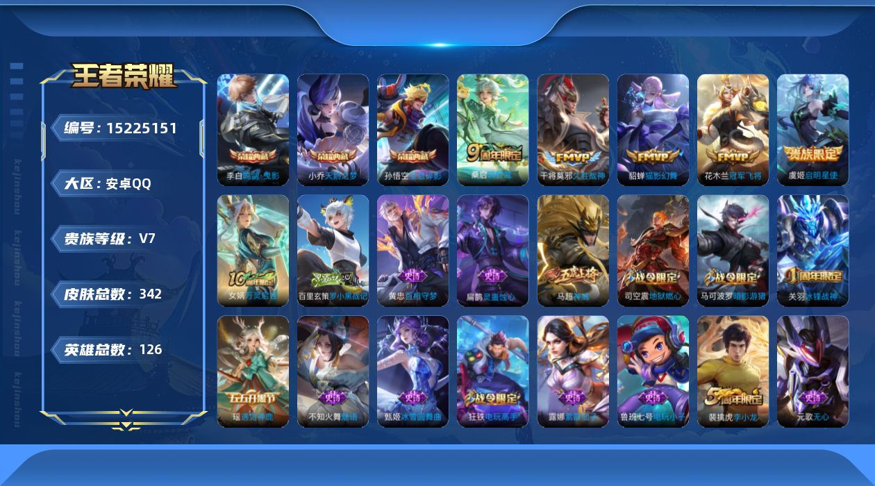 [15225151]【店主推荐捡漏号!可直接换绑】安卓Q-V7-最强王者段位-126英雄-342皮肤-3典藏皮肤-6传说-92史诗