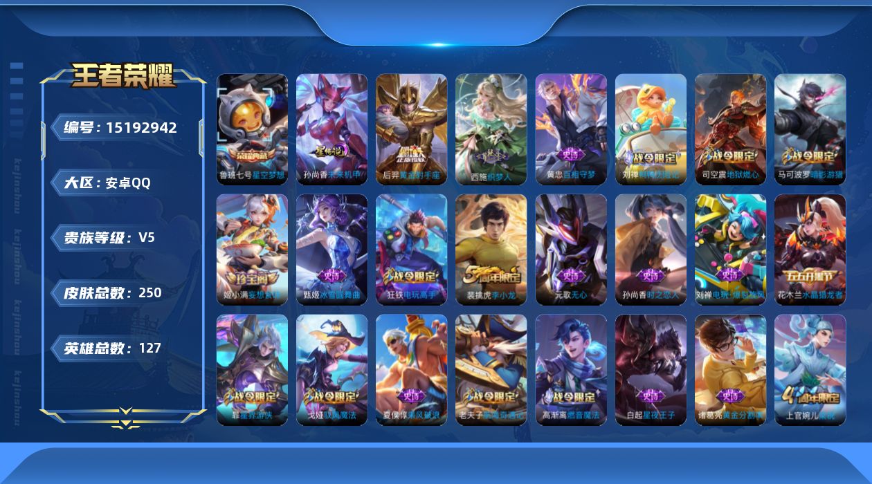 [15192942]安卓Q-V7-永恒钻石IV段位-127英雄-250皮肤-1典藏-2传说-48史诗 【荣耀典藏】:鲁班七号星空梦想 【传说皮肤】:后羿神树通天,后羿黄金射手座 【限定皮肤】:蔡文姬夏日便利店,虞姬夏日便利店,姜子牙天穹之誓,杨戬破阵退雄兵,狄仁杰阴阳师,赵云皇家上将,墨子神迹守卫,嬴政优雅恋人,鲁班七号狮舞东方,庄周高山流水,钟无艳超时空战士,扁鹊奇幻香踪,白起夜都怪侠,芈月重明,芈月幻夜卜梦,元歌无心,夏侯惇朔风刀,甄姬落雪兰心,典韦穷奇,马可波罗暗影游猎,狄仁杰魔术师,达摩沙漠行僧,项羽海滩派对,老夫子醍醐杖,老夫子航海奇遇记,程咬金演武夺筹,王昭君午后时光,兰陵王金庭之子,后羿圣弓游侠,李元芳云中旅人,钟馗驱傩正仪,杨戬潮玩骑兵,干将莫邪真爱魔法,鬼谷子原初探秘者,黄忠火炮绅士,苏烈千军破阵,沈梦溪大漠名商,明世隐疑决卦,明世隐吟游魔法,裴擒虎李小龙,裴擒虎擒涛扼浪,狂铁御狮,狂铁电玩高手,米莱狄御霄,盾山御銮,上官婉儿梁祝,嫦娥暖冬兔眠,西施玲珑珍味,鲁班大师探海日志,桑启海盐诗旅,暃星界游侠,戈娅驭风魔法,艾琳流音漫舞,司空震地狱燃心,阿古朵江河有灵,张良古海寻踪,高渐离燃音魔法,妲己灵卜魔法,鬼谷子天穹祈灯,姬小满妄想食味,鲁班七号蔬乡物语,李元芳蔬乡物语,刘邦剑破天穹,程咬金群星魔术团,镜青焰无极,项羽苍威无极,周瑜熔金海岸 【赛季限定】:芈月重明,夏侯惇朔风刀,典韦穷奇,达摩沙漠行僧,老夫子醍醐杖,程咬金演武夺筹,兰陵王金庭之子,张良古海寻踪,李元芳云中旅人,钟馗驱傩正仪,鬼谷子原初探秘者,苏烈千军破阵,沈梦溪大漠名商,明世隐疑决卦,裴擒虎擒涛扼浪,狂铁御狮,米莱狄御霄,盾山御銮,鲁班大师探海日志,桑启海盐诗旅,鬼谷子天穹祈灯,刘邦剑破天穹,姜子牙天穹之誓 【战令限定】:墨子神迹守卫,蔡文姬夏日便利店,虞姬夏日便利店,鲁班七号狮舞东方,钟无艳超时空战士,扁鹊奇幻香踪,白起夜都怪侠,芈月幻夜卜梦,甄姬落雪兰心,马可波罗暗影游猎,老夫子航海奇遇记,王昭君午后时光,艾琳流音漫舞,后羿圣弓游侠,杨戬潮玩骑兵,干将莫邪真爱魔法,黄忠火炮绅士,明世隐吟游魔法,狂铁电玩高手,嫦娥暖冬兔眠,西施玲珑珍味,司空震地狱燃心,暃星界游侠,戈娅驭风魔法,高渐离燃音魔法,妲己灵卜魔法,鲁班七号蔬乡物语,李元芳蔬乡物语,镜青焰无极,项羽苍威无极 【史诗皮肤】:赵云皇家上将,赵云