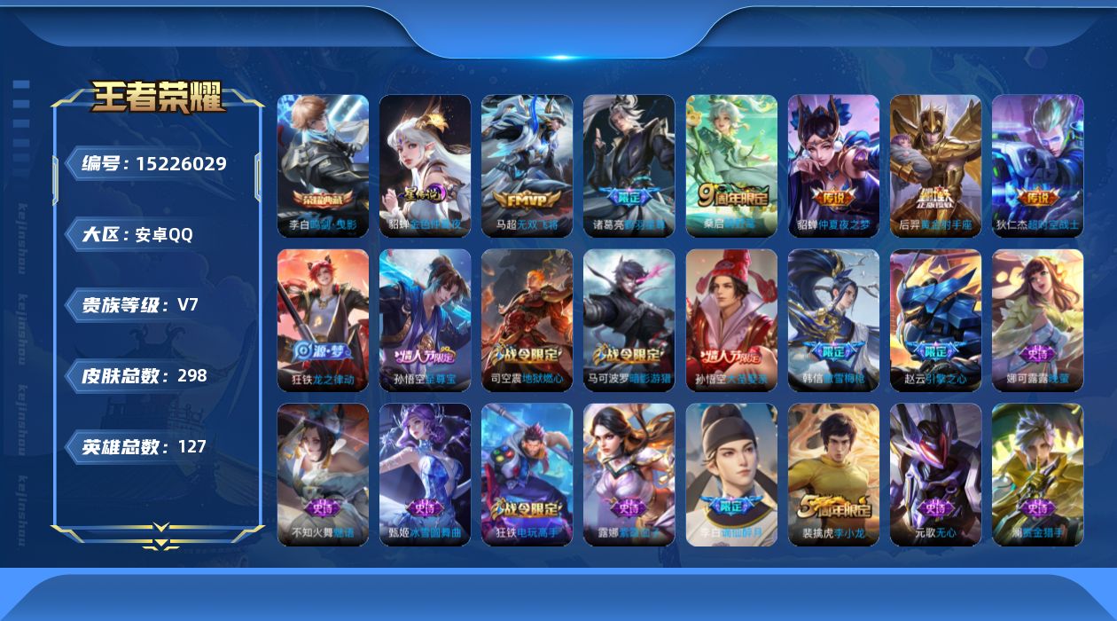 [15226029]【店主推荐捡漏号!可直接换绑】安卓Q-V7-最强王者段位-127英雄-298皮肤-1典藏皮肤-7传说-89史诗-1星元