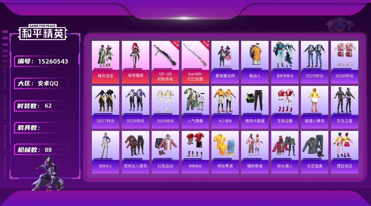 [15260543]安卓 手Q-2粉装-2特效枪-0载具-2粉色飞行器-28293热力值-10王牌印记-62套装-88枪皮