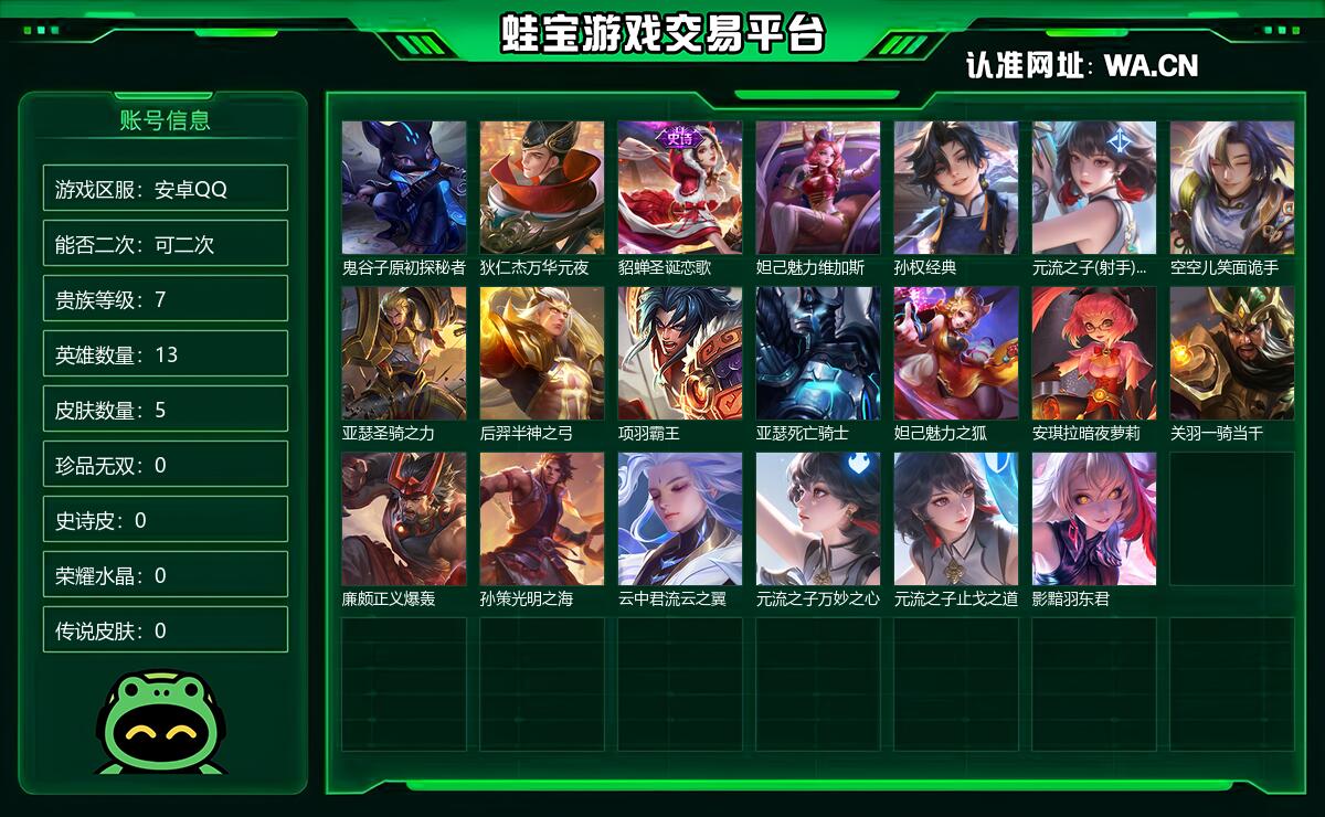 - [11868175]V10 5典藏 1珍品无双 2无双 7珍品传说 50传说 125英雄 486皮肤 可修改实名 优质装备:馥梦繁花,无限飓风号(高达),活力突击,鸣剑·曳影,全息碎影(猴子典藏),弑枪猎影(韩信典藏),碎月剑心(李白无双),器灵·螭龙剑,江户川柯南,怪盗基德,酷洛米之心,大耳狗之梦,朽木白哉,黑崎一护,黄金狮子座,黄金射手座,冠军飞将,云鹰飞将(小将军),黄金白羊座,猫影幻舞,久胜战神,炽阳神光,一念神魔,末日机甲-孙尚香(绿蚂蚱),地狱火,仲夏夜之梦(大飞蛾),零号·赤焰,地狱之眼,李逍遥,时之恋人-刘备(电焊工),淬星耀世,超时空战士-狄仁杰,山海·炽霜斩(李信年限),山海·琳琅生(小乔年限),鹤羽星尊,妄想实况,霜月吟,澜逐花归海,艾琳觅芳踪,黄金天蝎座,牧神诗旅,玄雷天君 珍品传说:兔狲·蓬尾 传说皮:乘龙·铭钟鼎(赵云年限),乘龙·淬吴钩(孙策年限),典韦战鼓燎原,铠冥王哈迪斯,祥瑞亨通,幻光神枪 珍宝阁皮:万物之道,蔷薇恋人,女武神 限定皮:愿照·九州拓(澜年限),愿照·福禄聚(蔡文姬年限),愿照·岁时盈(虞姬年限),愿照·山河定(司空震年限),愿照·众生和(妲己年限),愿照·千秋盛(女娲年限),逐霄战戟,映山客,陌上桑,鸣野蒿,夏侯惇霜北刀,至尊宝,白虎志(电光耗子),凤求凰(白切鸡),武陵仙君(小桃花),魔法小厨娘,时雨天司(水龙头),神威(电光马子),飞衡(韩信年限),山海·碧波行(瑶年限),遇见飞天,高山流水,诗剑行,齐天大圣,五谷丰年,青龙志(铠年限),梁祝,御风骁将(吕布年限),龙胆,逐梦之星,岱宗(典韦年限),李小龙,逐梦之影,玄武志(苏烈年限),辉光之辰,默契交锋-花木兰,孙行者,一生所爱,大圣娶亲,冰霜恋舞曲,乒乒小将,寅虎·御盾(廉颇年限),百木心枪,神器·万象笔,梦圆繁星 史诗皮:鸭鸭历险记-刘禅,苍鳞隐世,器灵·浮梦炉,糖绘人间,狼魂孤将,绮世丹青,化蝶舞,灵蛊蚀心,星界战将,谪仙醉月,龙之律动,雪豹·霜爪,藏狐·褐绒,布丁狗之誓,石田雨龙,百相守梦-周瑜,茶境仙,炽弈燎原,撼地雄心,破空之剑,涂山红红,东方月初,蒙犽顽岩魄,埋骨钱,琥珀纪元伽罗,决胜骁骑,蔬乡物语(鲁班七号),百相守梦-百里守约,星界特工,紫霞仙子,苍穹之光,电玩小子(小书包),白龙吟,黄金分割率,特工魅影,千年之狐,永昼,真我赫兹(镜),魅语,百解令(蒙犽)