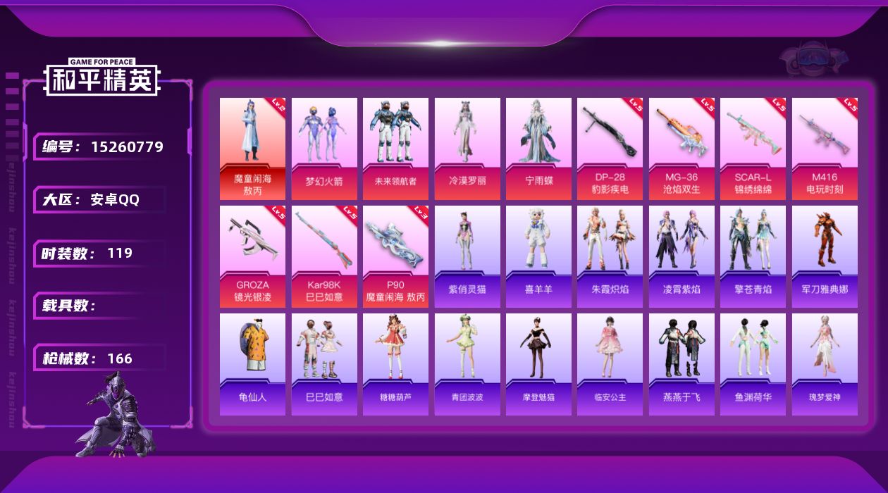 [15260779]【店主推荐捡漏号!可直接换绑】素材身法号/绝世印记1 安卓 手Q-1神装-4粉装-7特效枪-4粉色飞行器-4.8w热力值-9王牌印记-119套装-166枪皮【红色神装等级】:魔童闹海-敖丙(二级)【热门品类】:粉装-梦幻火箭,角色-军刀雅典娜,套装-龟仙人【粉色套装】:粉装-梦幻火箭,粉装-未来领航者,角色-冷漠罗丽,角色-宁雨蝶【粉色枪皮等级】:SCAR-L-锦绣绵绵(五级),M416-电玩时刻(五级),GROZA-镜光银凌(五级),P90-魔童闹海 敖丙(三级),Kar98K-巳巳如意(五级),DP-28-豹影疾电(五级),MG-36-沧焰双生(五级)【粉色飞行器】:梦幻火箭飞行器,青春物语飞行器,脆鲨七海飞行器,飞天猪飞行器