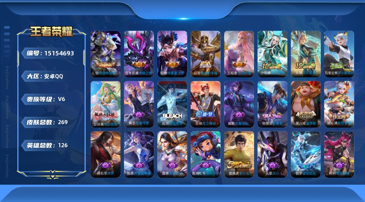 [15154693]【店主推荐捡漏号!可直接换绑】安卓Q-V6-最强王者段位-126英雄-269皮肤-1典藏-5传说-72史诗
