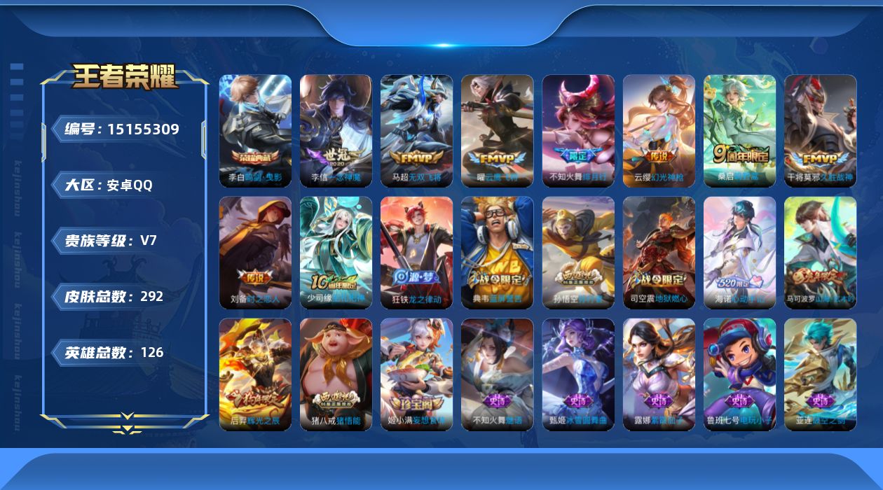 [15155309]可二次,【店主推荐捡漏号!可直接换绑】安卓Q-V7-荣耀黄金II段位-126英雄-292皮肤-1典藏-8传说-80史诗