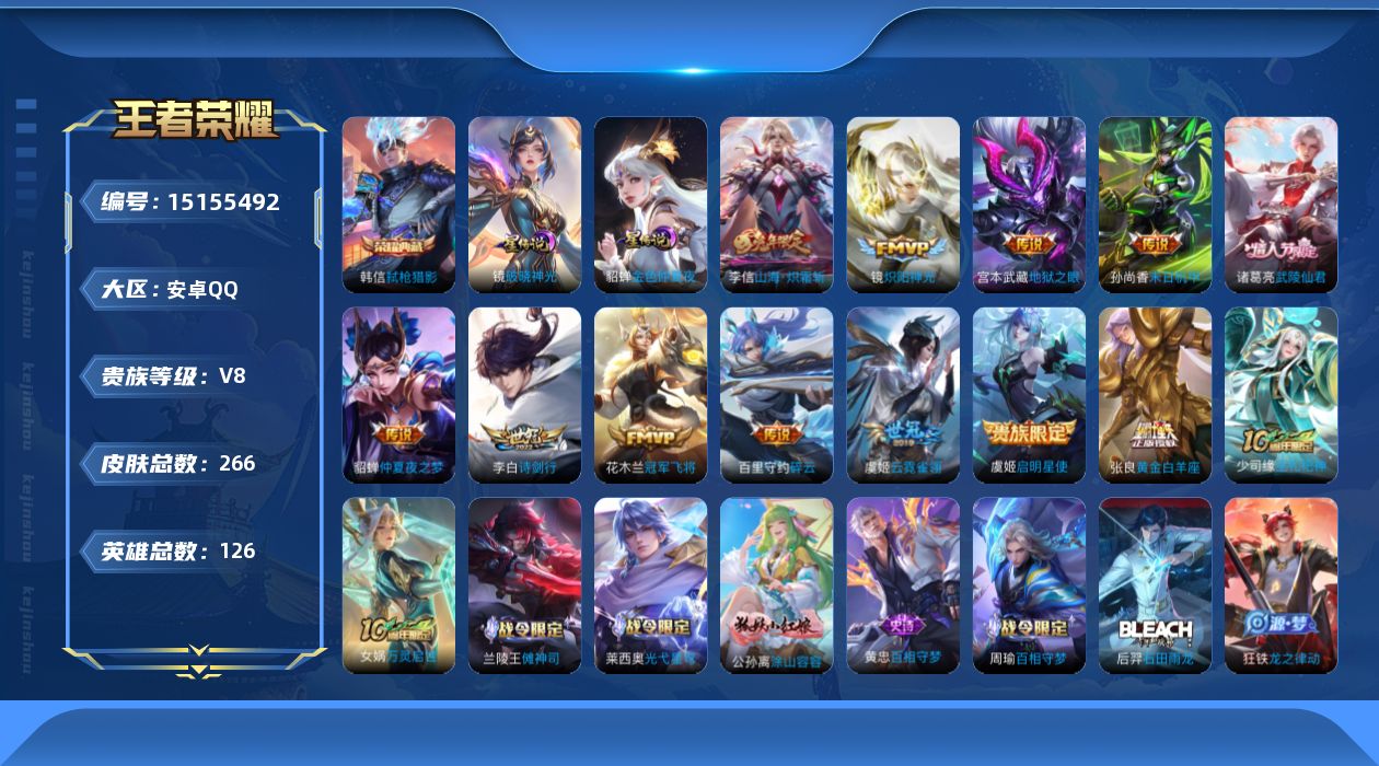 [15155492]【店主推荐捡漏号!可直接换绑】:安卓Q-V8-永恒钻石I段位-126英雄-266皮肤-1典藏-2星元-13传说-73史诗 【英雄全皮】:孙权全皮,鬼谷子全皮,狂铁全皮,空空儿全皮,影全皮 【荣耀典藏】:韩信弑枪猎影 【传说皮肤】:后羿神树通天,李信山海炽霜斩,李白诗剑行,百里守约碎云,镜炽阳神光,虞姬启明星使,张良黄金白羊座,虞姬云霓雀翎,花木兰冠军飞将,诸葛亮武陵仙君,貂蝉仲夏夜之梦,孙尚香末日机甲,宫本武藏地狱之眼 【限定皮肤】:白起狰,狄仁杰阴阳师,赵云皇家上将,妲己时之奇旅,嬴政优雅恋人,鲁班七号狮舞东方,高渐离死亡摇滚,高渐离玩趣恶龙,阿轲迷踪丽影,孙膑寅虎展翼,芈月重明,吕布猎兽之王,周瑜赤莲之焰,元歌无心,夏侯惇朔风刀,曹操烛龙,典韦穷奇,狄仁杰魔术师,狄仁杰万华元夜,达摩沙漠行僧,项羽海滩派对,老夫子圣诞老人,老夫子醍醐杖,刘邦夺宝奇兵,韩信飞衡,王昭君午后时光,兰陵王驯魔猎人,兰陵王金庭之子,孙悟空至尊宝,孙悟空大圣娶亲,牛魔御旌,李元芳云中旅人,虞姬启明星使,钟馗神迹守卫,钟馗驱傩正仪,杨玉环遇见飞天,蔡文姬奇迹圣诞,蔡文姬繁星吟游,太乙真人饕餮,太乙真人华丽摇滚,鬼谷子原初探秘者,鬼谷子五谷丰年,诸葛亮武陵仙君,百里守约朱雀志,弈星混沌棋,沈梦溪大漠名商,明世隐疑决卦,裴擒虎李小龙,裴擒虎擒涛扼浪,狂铁御狮,狂铁电玩高手,米莱狄御霄,米莱狄胡桃异想国,云中君纤云弄巧,李信山海炽霜斩,盾山御銮,上官婉儿梁祝,嫦娥暖冬兔眠,鲁班大师探海日志,桑启海盐诗旅,阿古朵江河有灵,张良古海寻踪,鬼谷子天穹祈灯,沈梦溪龙舞盛年,刘邦剑破天穹,上官婉儿群星魔术团,项羽苍威无极 【年限皮肤】:百里守约朱雀志,孙膑寅虎展翼,韩信飞衡,李信山海炽霜斩 【赛季限定】:白起狰,芈月重明,夏侯惇朔风刀,曹操烛龙,典韦穷奇,狄仁杰万华元夜,达摩沙漠行僧,老夫子醍醐杖,兰陵王金庭之子,张良古海寻踪,牛魔御旌,李元芳云中旅人,钟馗驱傩正仪,太乙真人饕餮,鬼谷子原初探秘者,弈星混沌棋,沈梦溪大漠名商,明世隐疑决卦,裴擒虎擒涛扼浪,狂铁御狮,米莱狄御霄,盾山御銮,鲁班大师探海日志,桑启海盐诗旅,鬼谷子天穹祈灯,刘邦剑破天穹 【战令限定】:鲁班七号狮舞东方,阿轲迷踪丽影,吕布猎兽之王,周瑜赤莲之焰,刘邦夺宝奇兵,王昭君午后时光,兰陵王驯魔猎人,钟馗神迹守卫,狂铁电玩高手,米莱狄胡桃异