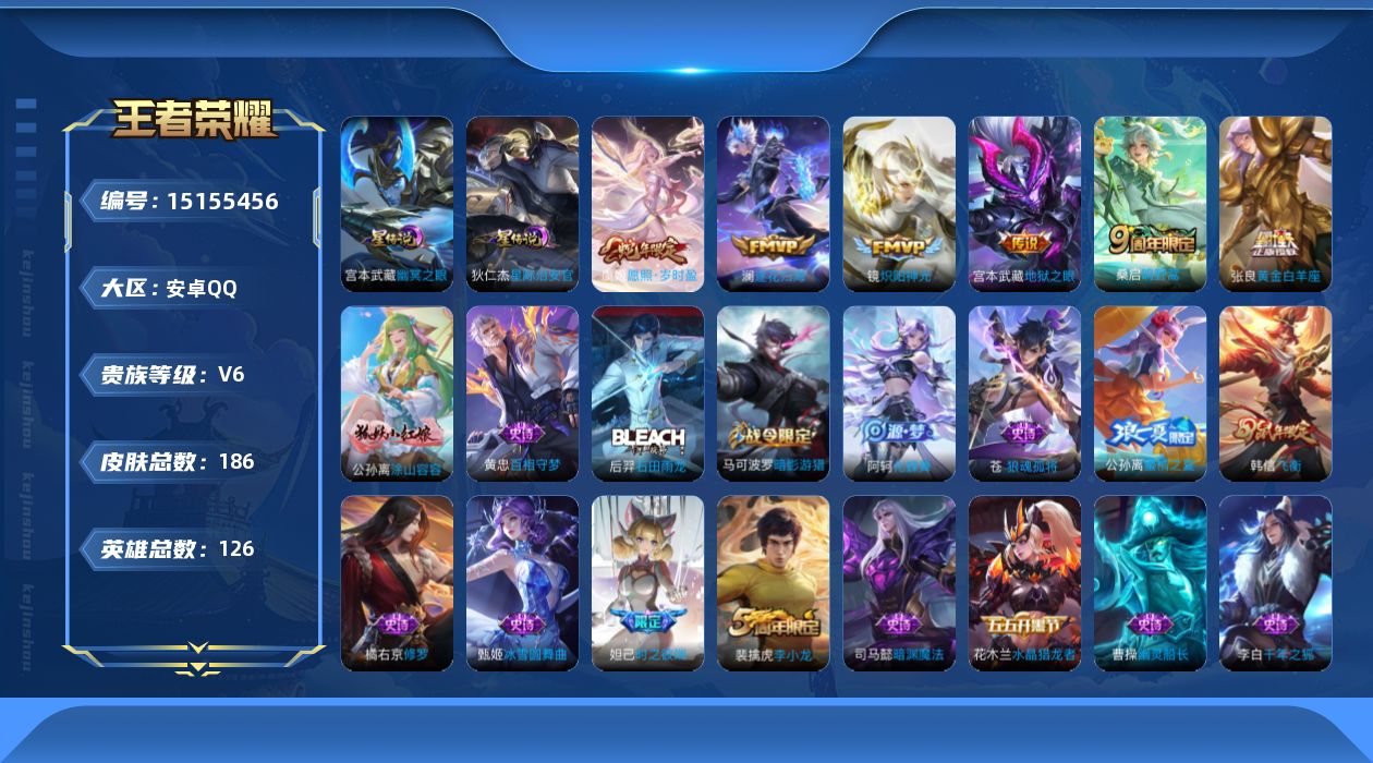 - [12090597]V8 2典藏 1无双 3珍品传说 26传说 125英雄 338皮肤 可修改实名 优质装备:鸣剑·曳影,全息碎影(猴子典藏),天机白泽,怪盗基德,黑崎一护,黄金狮子座,黄金射手座,云鹰飞将(小将军),绛天战甲(鸡嘴战神),黄金白羊座,久胜战神,炽阳神光,一念神魔,末日机甲-孙尚香(绿蚂蚱),仲夏夜之梦(大飞蛾),零号·赤焰,飞鸢探春,乞巧织情,超时空战士-狄仁杰,山海·炽霜斩(李信年限),鹤羽星尊,澜逐花归海 珍品传说:时之奇旅-孙策 传说皮:九山相柳 珍宝阁皮:万物之道,蔷薇恋人,玩趣恶龙 限定皮:愿照·九州拓(澜年限),愿照·岁时盈(虞姬年限),陌上桑,鸣野蒿,至尊宝,时雨天司(水龙头),遇见飞天,高山流水,诗剑行,五谷丰年,游园惊梦,梁祝,逐梦之星,祈雪灵祝(雪兔子),李小龙,霸王别姬-虞姬,启示之音,山海·玄木吟(马可年限) 史诗皮:赞萌露比,鸭鸭历险记-刘禅,器灵·浮梦炉,化蝶舞,灵蛊蚀心,星界战将,谪仙醉月,龙之律动,雪豹·霜爪,石田雨龙,百相守梦-周瑜,茶境仙,破空之剑,东方月初,蒙犽顽岩魄,埋骨钱,海诺心动手记,琥珀纪元伽罗,蔬乡物语(鲁班七号),百相守梦-百里守约,百相守梦-黄忠,紫霞仙子,苍穹之光,电玩小子(小书包),白龙吟,黄金分割率,特工魅影,千年之狐,魅语,蒙恬荣光圣徽,冰冠公主,青蛇,偶像歌手,电玩·爆裂旋风,暗夜猫娘,龙骑士(小龙虾),末日机甲-吕布,猫狗日记-孙策,猫狗日记-大乔,修罗,女仆咖啡,摇滚巨星,水果甜心,星夜王子,心灵骇客,功夫厨神,德古拉伯爵,暗隐猎兽者,幽灵船长,鬼剑武藏,心灵战警,天秀·启明,舞动绿茵,地狱岩魂,纤云弄巧,繁星吟游(呼啦呼啦),缤纷独角兽,乘风破浪,逐浪之夏,月团寄思,水晶猎龙者,曙光守护者,箭羽风息,金属风暴,原初追逐者,圣诞狂欢,鹰眼统帅,暗夜贵公子,黎明之约,赏金猎手,无心,未来纪元-赵云