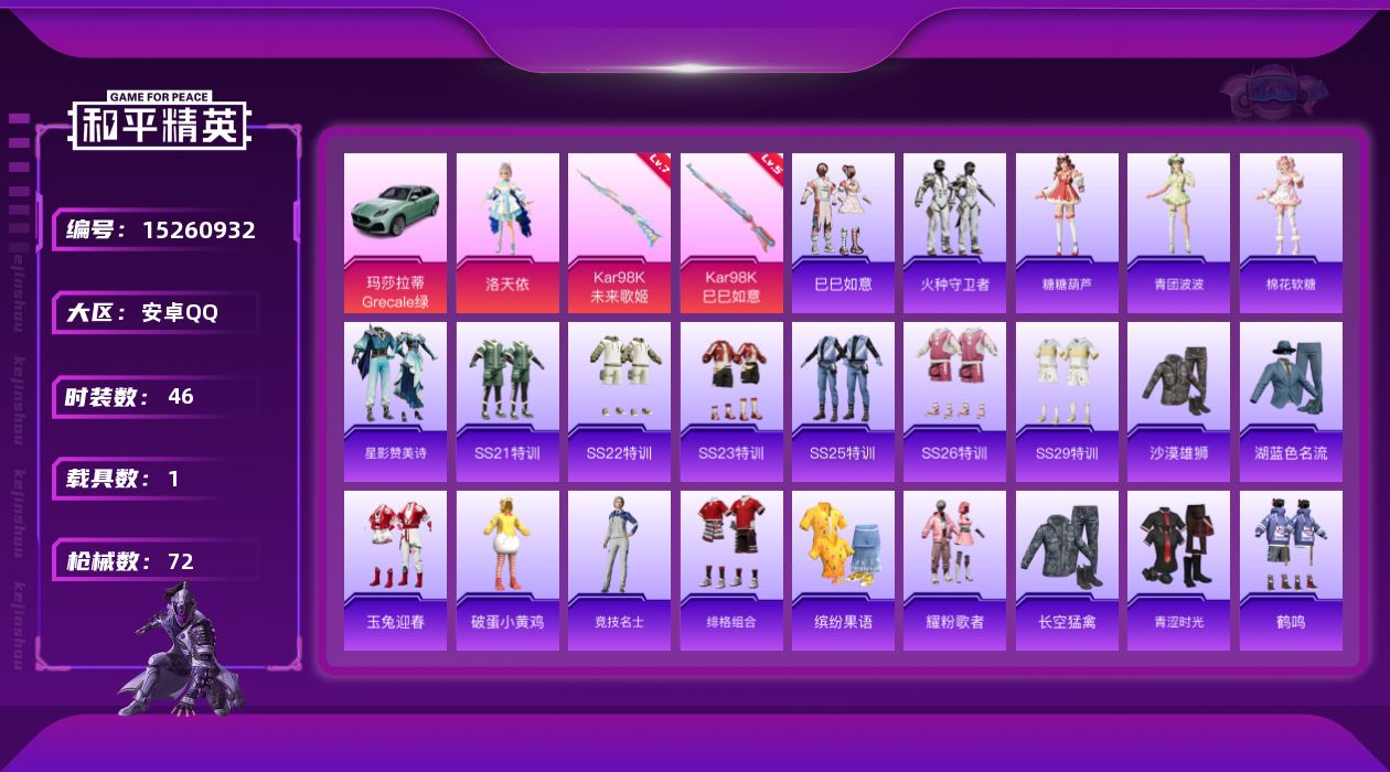 [15260932]不可二次【店主推荐捡漏号!可直接换绑】/地铁满天赋 安卓 手Q-1粉装-2特效枪-1载具-2.4w热力值-2王牌印记-46套装-72枪皮【粉色载具】:玛莎拉蒂Grecale(薄荷绿)【粉色套装】:角色-洛天依【粉色枪皮等级】:Kar98K-未来歌姬(七级),Kar98K-巳巳如意(五级)