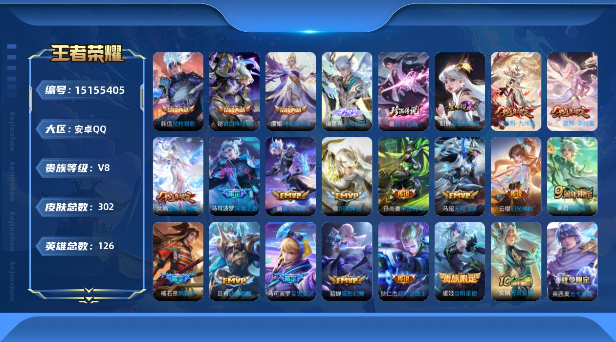 [15155405]【店主推荐捡漏号!可直接换绑】安卓Q-V8-最强王者段位-126英雄-302皮肤-3典藏-1无双-1珍品传说-17传说-84史诗
