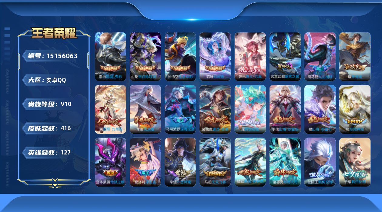 [15156063]【店主推荐捡漏号!可直接换绑】安卓Q-V10-最强王者段位-127英雄-415皮肤-4典藏皮肤-1无双-2星传说-52传说-128史诗 【英雄全皮】:刘禅全皮,司马懿全皮,孙权全皮,娜可露露全皮,李信全皮,鲁班大师全皮,夏洛特全皮,金蝉全皮,赵怀真全皮,戈娅全皮,影全皮,少司缘全皮 【荣耀典藏】:孙悟空全息碎影,李白鸣剑曳影,铠银白咏叹调,貂蝉幻阙歌 【无双皮肤】:妲己青丘九尾 【传说皮肤】:后羿神树通天,司马懿九山相柳,澜愿照九州拓,云缨幻光神枪,桑启鸣野蒿,赵云乘龙铭钟鼎,艾琳觅芳踪,宫本武藏惊梅引,云缨鹤归松栖,东皇太一灼幽烈阳,亚瑟追逃游戏,安琪拉追逃游戏,张飞百相守梦,公孙离记忆之芯,夏洛特浮生妄,项羽无限倾心,孙悟空齐天大圣,曜山海苍雷引,李信山海炽霜斩,吕布怒海麟威,李白诗剑行,百里守约碎云,娜可露露前尘镜,马可波罗深海之息,马超无双飞将,孙策挚爱之约,孙策末日机甲,瑶时之祈愿,裴擒虎寅虎赤拳,孙尚香异界灵契,赵云淬星耀世,王昭君乞巧织情,曜李逍遥 ,周瑜音你心动,兰陵王默契交锋,诸葛亮时雨天司,铠绛天战甲,镜炽阳神光,虞姬启明星使,曜云鹰飞将,李信一念神魔,刘备时之恋人,貂蝉猫影幻舞,干将莫邪久胜战神,虞姬云霓雀翎,花木兰冠军飞将,梦奇胖达荣荣,后羿黄金射手座,李白凤求凰,宫本武藏地狱之眼,孙悟空地狱火,狄仁杰超时空战士 【限定皮肤】:蔡文姬夏日便利店,大乔绒语心约,虞姬夏日便利店,姜子牙天穹之誓,狄仁杰阴阳师,赵云皇家上将,赵云百木心枪,孙尚香异界灵契,钟无艳超时空战士,扁鹊奇幻香踪,白起夜都怪侠,芈月幻夜卜梦,元歌云间偶戏,元歌无心,夏侯惇匿光决锋者,甄姬落雪兰心,马可波罗暗影游猎,马可波罗深海之息,马可波罗山海玄木吟,狄仁杰魔术师,达摩星际陆战队,达摩沙漠行僧,项羽海滩派对,项羽无限倾心,关羽百相守梦,安琪拉追逃游戏,韩信傲雪梅枪,王昭君午后时光,兰陵王默契交锋,兰陵王驯魔猎人,兰陵王金庭之子,花木兰默契交锋,娜可露露前尘镜,亚瑟追逃游戏,孙悟空至尊宝,孙悟空孙行者,孙悟空齐天大圣,后羿圣弓游侠,刘备百相守梦,张飞百相守梦,李元芳匿光侦查者,李元芳云中旅人,虞姬启明星使,钟馗神迹守卫,杨戬潮玩骑兵,雅典娜黎明之约,蔡文姬繁星吟游,鬼谷子五谷丰年,诸葛亮时雨天司,黄忠火炮绅士,铠青龙志,苏烈玄武志,百里守约朱雀志,沈梦溪大漠名商,沈梦溪匿光破解