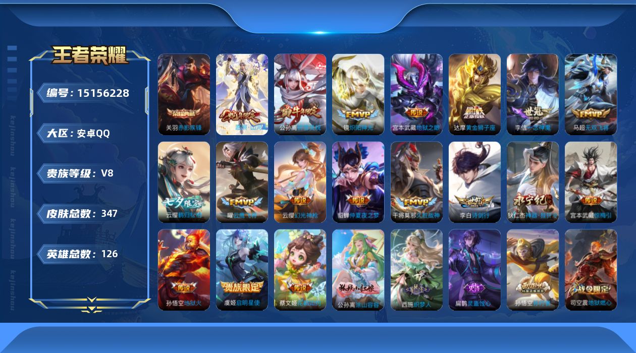 [15156228]【店主推荐捡漏号!可直接换绑】:安卓Q-V8-最强王者段位-126英雄-347皮肤-1典藏皮肤-2星元-18传说-97史诗