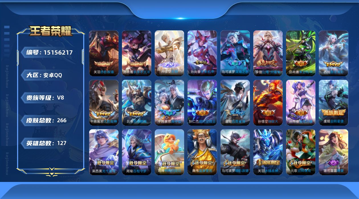 [15156217]可二次【店主推荐捡漏号!可直接换绑】,安卓Q-V8-永恒钻石I段位-125英雄-261皮肤-2典藏皮肤-12传说-68史诗 【荣耀典藏】:孙尚香杀手不太冷,关羽赤影疾锋 【传说皮肤】:干将莫邪画中仙,李信山海炽霜斩,吕布怒海麟威,孙尚香音你闪耀,马可波罗深海之息,西施游龙清影,虞姬启明星使,干将莫邪久胜战神,虞姬云霓雀翎,孙尚香末日机甲,孙悟空地狱火,狄仁杰超时空战士 【限定皮肤】:白起狰,狄仁杰阴阳师,虞姬凯尔特女王,赵云皇家上将,墨子神迹守卫,妲己时之彼端,嬴政白昼王子,孙尚香蔷薇恋人,鲁班七号狮舞东方,庄周高山流水,阿轲迷踪丽影,钟无艳王者之锤,钟无艳超时空战士,扁鹊炼金王,芈月重明,吕布猎兽之王,周瑜赤莲之焰,元歌云间偶戏,元歌无心,夏侯惇朔风刀,甄姬落雪兰心,曹操烛龙,典韦穷奇,典韦蓝屏警告,马可波罗逐梦之星,马可波罗暗影游猎,马可波罗深海之息,狄仁杰魔术师,狄仁杰万华元夜,达摩星际陆战队,达摩沙漠行僧,项羽海滩派对,老夫子醍醐杖,老夫子航海奇遇记,关羽冰锋战神,程咬金演武夺筹,刘邦夺宝奇兵,兰陵王驯魔猎人,兰陵王金庭之子,亚瑟潮玩骑士王,牛魔御旌,李元芳银河之约,李元芳云中旅人,虞姬启明星使,钟馗神迹守卫,钟馗驱傩正仪,杨玉环遇见飞天,女娲朔望之晖,干将莫邪胡桃夹子,干将莫邪画中仙,雅典娜单词大作战,雅典娜黎明之约,蔡文姬繁星吟游,太乙真人饕餮,太乙真人华丽摇滚,鬼谷子原初探秘者,鬼谷子五谷丰年,苏烈千军破阵,百里玄策原初追逐者,弈星混沌棋,梦奇顽趣,沈梦溪星空之诺,沈梦溪大漠名商,明世隐疑决卦,裴擒虎李小龙,裴擒虎擒涛扼浪,狂铁御狮,米莱狄御霄,米莱狄胡桃异想国,李信山海炽霜斩,盾山御銮,猪八戒西部大镖客,上官婉儿梁祝,嫦娥暖冬兔眠,蒙犽狂想玩偶喵,鲁班大师探海日志,桑启海盐诗旅,暃星界游侠,张良古海寻踪,鬼谷子天穹祈灯,李元芳蔬乡物语 【年限皮肤】:李信山海炽霜斩 【赛季限定】:扁鹊炼金王,白起狰,芈月重明,夏侯惇朔风刀,曹操烛龙,典韦穷奇,狄仁杰万华元夜,达摩沙漠行僧,老夫子醍醐杖,程咬金演武夺筹,兰陵王金庭之子,张良古海寻踪,牛魔御旌,李元芳云中旅人,虞姬凯尔特女王,钟馗驱傩正仪,雅典娜黎明之约,太乙真人饕餮,鬼谷子原初探秘者,苏烈千军破阵,百里玄策原初追逐者,弈星混沌棋,梦奇顽趣,沈梦溪大漠名商,明世隐疑决卦,裴擒虎擒涛扼浪,狂铁御狮,米莱狄