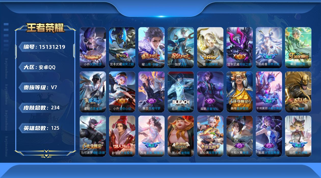 - [11657222]V8 1典藏 4无双 7珍品传说 40传说 105英雄 174皮肤 可修改实名 优质装备:银白咏叹调(倪克斯侍卫),韩信群星魔术团(韩信无双),花合斗,离恨烟(公孙离无双),器灵·螭龙剑,江户川柯南,怪盗基德,器灵·落星盏,酷洛米之心,大耳狗之梦,云鹰飞将(小将军),绛天战甲(鸡嘴战神),黄金白羊座,久胜战神,一念神魔,云霓雀翎,零号·赤焰,海洋之心,音你心动-周瑜,挚爱之约,无双飞将,山海·炽霜斩(李信年限),燃星之曲,浮生妄,妄想实况,妄想奇谈,澜逐花归海,黄金天蝎座,玄雷天君,涂山容容 珍品传说:时之奇旅-孙策,兔狲·蓬尾 传说皮:吕布曦玄引,云诺千山,铠冥王哈迪斯,续相思,星之鸣奏,祥瑞亨通,幻光神枪 珍宝阁皮:万物之道 限定皮:愿照·九州拓(澜年限),愿照·福禄聚(蔡文姬年限),愿照·岁时盈(虞姬年限),愿照·山河定(司空震年限),愿照·众生和(妲己年限),愿照·千秋盛(女娲年限),逐霄战戟,映山客,陌上桑,鸣野蒿,夏侯惇霜北刀,时雨天司(水龙头),诗剑行,怒海麟威,御风骁将(吕布年限),引擎之心,启示之音,冰霜神祇 史诗皮:鸭鸭历险记-刘禅,苍鳞隐世,器灵·浮梦炉,糖绘人间,狼魂孤将,绮世丹青,瑰影绮梦,化蝶舞,谪仙醉月,龙之律动,藏狐·褐绒,布丁狗之誓,茶境仙,怒海争锋,炽弈燎原,破空之剑,战舞者,东方月初,蒙犽顽岩魄,埋骨钱,海诺心动手记,百相守梦-百里守约,星界特工,百相守梦-黄忠,特工魅影,冰冠公主,青蛇,偶像歌手,暗夜猫娘,女仆咖啡,水果甜心,星夜王子,功夫厨神,鬼剑武藏,天秀·启明,地狱岩魂,缤纷独角兽,乘风破浪,逐浪之夏,月团寄思,水晶猎龙者,曙光守护者,金属风暴,圣诞恋歌,鹰眼统帅,魅力维加斯,赏金猎手,未来纪元-赵云