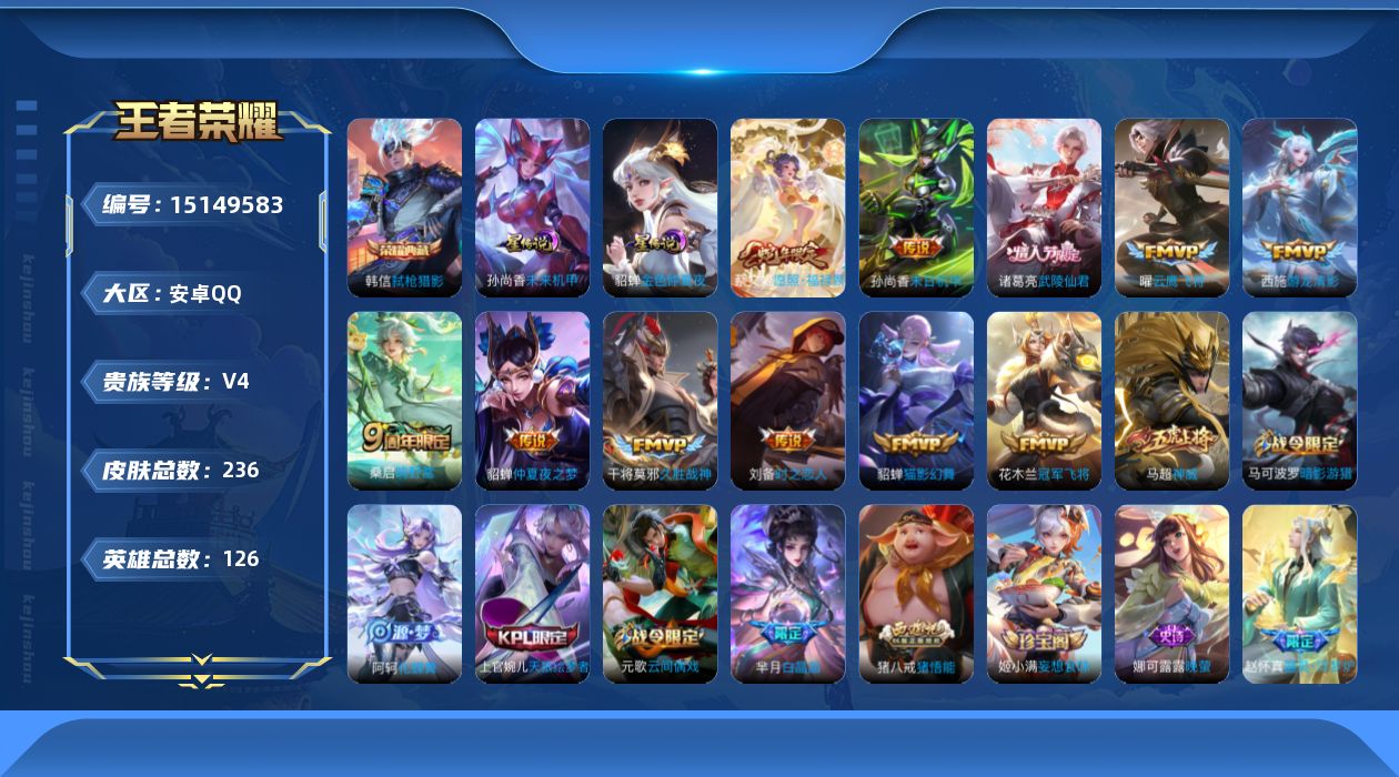 [15149583]可二次【店主推荐捡漏号!可直接换绑】安卓Q-V4-最强王者段位-126英雄-236皮肤-1典藏皮肤-11传说-62史诗-2星元 【英雄全皮】:猪八戒全皮 【荣耀典藏】:韩信弑枪猎影 【传说皮肤】:蔡文姬愿照福禄聚,桑启鸣野蒿,西施游龙清影,曜云鹰飞将,刘备时之恋人,貂蝉猫影幻舞,干将莫邪久胜战神,花木兰冠军飞将,诸葛亮武陵仙君,貂蝉仲夏夜之梦,孙尚香末日机甲 【限定皮肤】:姜子牙天穹之誓,狄仁杰阴阳师,赵云皇家上将,嬴政优雅恋人,孙尚香蔷薇恋人,鲁班七号狮舞东方,庄周高山流水,芈月白晶晶,元歌云间偶戏,夏侯惇朔风刀,马可波罗暗影游猎,狄仁杰魔术师,狄仁杰万华元夜,达摩星际陆战队,达摩沙漠行僧,项羽海滩派对,项羽霸王别姬,老夫子醍醐杖,程咬金演武夺筹,韩信飞衡,兰陵王金庭之子,亚瑟潮玩骑士王,后羿圣弓游侠,李元芳云中旅人,虞姬霸王别姬,钟馗神迹守卫,钟馗驱傩正仪,杨玉环遇见飞天,干将莫邪真爱魔法,雅典娜黎明之约,太乙真人华丽摇滚,鬼谷子原初探秘者,诸葛亮武陵仙君,苏烈千军破阵,弈星混沌棋,沈梦溪大漠名商,明世隐疑决卦,裴擒虎李小龙,裴擒虎擒涛扼浪,狂铁御狮,米莱狄御霄,米莱狄胡桃异想国,云中君纤云弄巧,盾山御銮,猪八戒西部大镖客,猪八戒猪悟能,上官婉儿梁祝,上官婉儿天狼绘梦者,嫦娥拒霜思,鲁班大师探海日志,桑启海盐诗旅,艾琳流音漫舞,张良古海寻踪,蒙犽百解令,高渐离燃音魔法,妲己灵卜魔法,鬼谷子天穹祈灯,姬小满妄想食味,沈梦溪龙舞盛年,刘邦剑破天穹 【年限皮肤】:韩信飞衡,马超神威 【赛季限定】:夏侯惇朔风刀,狄仁杰万华元夜,达摩沙漠行僧,老夫子醍醐杖,程咬金演武夺筹,兰陵王金庭之子,张良古海寻踪,李元芳云中旅人,钟馗驱傩正仪,雅典娜黎明之约,鬼谷子原初探秘者,苏烈千军破阵,弈星混沌棋,沈梦溪大漠名商,明世隐疑决卦,裴擒虎擒涛扼浪,狂铁御狮,米莱狄御霄,盾山御銮,鲁班大师探海日志,桑启海盐诗旅,鬼谷子天穹祈灯,刘邦剑破天穹,姜子牙天穹之誓 【战令限定】:鲁班七号狮舞东方,元歌云间偶戏,马可波罗暗影游猎,达摩星际陆战队,艾琳流音漫舞,亚瑟潮玩骑士王,后羿圣弓游侠,钟馗神迹守卫,干将莫邪真爱魔法,米莱狄胡桃异想国,猪八戒西部大镖客,高渐离燃音魔法,妲己灵卜魔法 【史诗皮肤】:露娜紫霞仙子,阿轲暗夜猫娘,赵云皇家上将,赵云未来纪元,貂蝉圣诞恋歌,甄姬冰雪圆舞曲,狄仁杰魔术