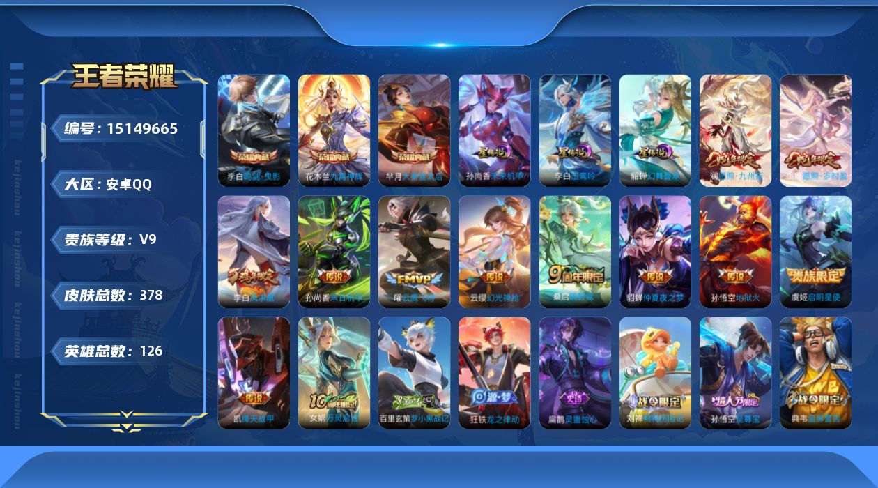 [15149665]【店主推荐捡漏号!可直接换绑】安卓Q-V9-最强王者段位-126英雄-378皮肤-3典藏皮肤-5星传说-12传说-116史诗