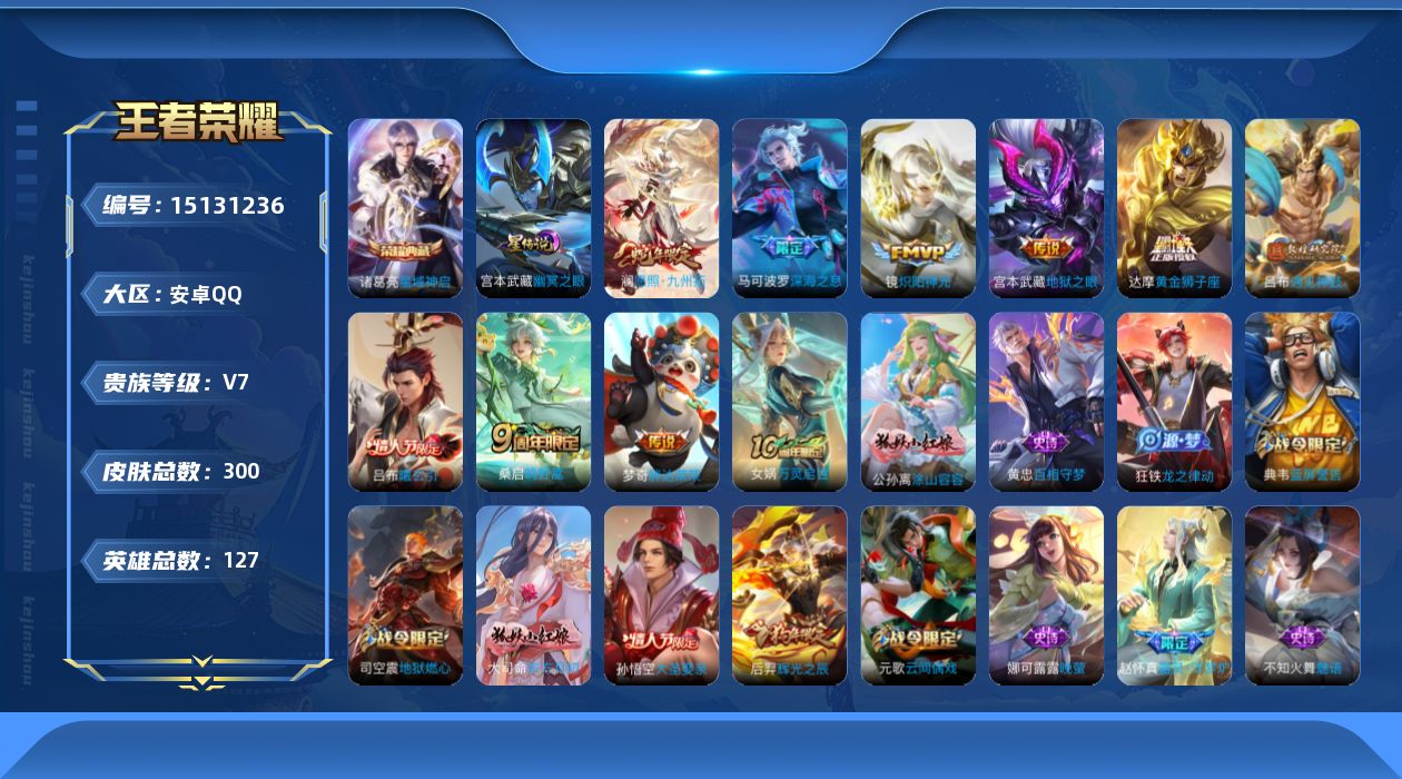 [15131236]【店主推荐捡漏号!可直接换绑】安卓Q-V7-最强王者段位-127英雄-300皮肤-1典藏皮肤-9传说-74史诗-1星元