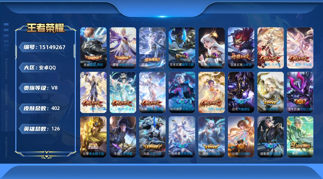 [15149267]可二次【店主推荐捡漏号!可直接换绑】背包有颗未使用的荣耀水晶 安卓Q-V8-至尊星耀III段位-126英雄-402皮肤-2典藏皮肤-1珍品传说2星传说-33传说-115史诗 【英雄全皮】:达摩全皮,孙权全皮,钟馗全皮,狂铁全皮,蒙恬全皮,司空震全皮,戈娅全皮 【荣耀典藏】:李白鸣剑曳影,虞姬神鉴启示录 【珍品传说】:嫦娥器灵落星盏 【传说皮肤】:后羿神树通天,司空震愿照山河定,女娲愿照千秋盛,妲己愿照众生和,澜愿照九州拓,蔡文姬愿照福禄聚,虞姬愿照岁时盈,云缨幻光神枪,桑启鸣野蒿,兰陵王影龙天霄,宫本武藏惊梅引,马可波罗妄想实况,诸葛亮鹤羽星尊,孙悟空齐天大圣,吕布怒海麟威,马可波罗深海之息,马超无双飞将,孙尚香异界灵契,赵云淬星耀世,王昭君乞巧织情,西施游龙清影,铠绛天战甲,镜炽阳神光,虞姬启明星使,孙悟空零号赤焰,李信一念神魔,貂蝉猫影幻舞,干将莫邪久胜战神,达摩黄金狮子座,百里玄策白虎志,貂蝉仲夏夜之梦,宫本武藏地狱之眼,吕布天魔缭乱 【限定皮肤】:白起狰,蒙犽顽岩魄,大乔绒语心约,姜子牙天穹之誓,杨戬破阵退雄兵,狄仁杰阴阳师,虞姬凯尔特女王,赵云皇家上将,赵云引擎之心,赵云龙胆,墨子神迹守卫,嬴政优雅恋人,孙尚香蔷薇恋人,孙尚香异界灵契,庄周高山流水,钟无艳王者之锤,钟无艳超时空战士,扁鹊炼金王,扁鹊奇幻香踪,白起夜都怪侠,芈月重明,芈月幻夜卜梦,吕布天魔缭乱,吕布猎兽之王,元歌云间偶戏,元歌无心,夏侯惇朔风刀,甄姬游园惊梦,甄姬落雪兰心,曹操烛龙,典韦穷奇,马可波罗暗影游猎,马可波罗深海之息,马可波罗妄想实况,狄仁杰魔术师,狄仁杰万华元夜,达摩星际陆战队,达摩沙漠行僧,项羽海滩派对,老夫子醍醐杖,老夫子航海奇遇记,关羽冰锋战神,貂蝉逐梦之音,程咬金演武夺筹,韩信傲雪梅枪,王昭君午后时光,兰陵王影龙天霄,兰陵王金庭之子,花木兰青春决赛季,花木兰默契交锋,亚瑟潮玩骑士王,孙悟空至尊宝,孙悟空零号赤焰,孙悟空齐天大圣,牛魔御旌,后羿圣弓游侠,刘备百相守梦,李元芳云中旅人,虞姬启明星使,钟馗神迹守卫,钟馗驱傩正仪,杨玉环遇见飞天,杨戬潮玩骑兵,干将莫邪真爱魔法,雅典娜单词大作战,雅典娜黎明之约,蔡文姬繁星吟游,太乙真人饕餮,鬼谷子原初探秘者,鬼谷子五谷丰年,诸葛亮鹤羽星尊,黄忠火炮绅士,苏烈玄武志,苏烈千军破阵,百里玄策白虎志,百里玄策原初追逐者,弈星混沌棋,梦
