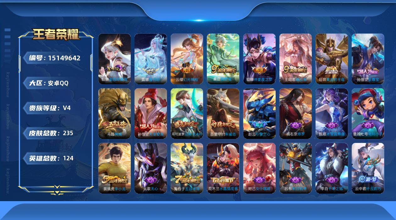 [15149642]可二次【店主推荐捡漏号!可直接换绑】,,安卓Q-V4-至尊星耀IV段位-124英雄-235皮肤-6传说-1星传说-49史诗 【英雄全皮】:蒙恬全皮 【传说皮肤】:云缨幻光神枪,王昭君映山客,桑启鸣野蒿,露娜霜月吟,后羿黄金射手座,貂蝉仲夏夜之梦 【限定皮肤】:白起狰,狄仁杰阴阳师,虞姬凯尔特女王,赵云皇家上将,赵云引擎之心,孙尚香蔷薇恋人,庄周高山流水,高渐离玩趣恶龙,芈月重明,元歌无心,夏侯惇朔风刀,曹操烛龙,典韦穷奇,马可波罗山海玄木吟,狄仁杰魔术师,狄仁杰万华元夜,达摩沙漠行僧,项羽海滩派对,老夫子醍醐杖,程咬金演武夺筹,兰陵王金庭之子,孙悟空至尊宝,孙悟空大圣娶亲,牛魔御旌,李元芳云中旅人,钟馗驱傩正仪,干将莫邪胡桃夹子,雅典娜黎明之约,太乙真人饕餮,鬼谷子原初探秘者,鬼谷子五谷丰年,苏烈千军破阵,百里玄策原初追逐者,百里守约朱雀志,弈星混沌棋,梦奇顽趣,沈梦溪大漠名商,明世隐疑决卦,裴擒虎李小龙,裴擒虎擒涛扼浪,狂铁御狮,米莱狄御霄,云中君纤云弄巧,盾山御銮,鲁班大师探海日志,桑启海盐诗旅,阿古朵江河有灵,张良古海寻踪,蒙恬荣光圣徽,鬼谷子天穹祈灯,沈梦溪龙舞盛年,刘邦剑破天穹,程咬金群星魔术团,周瑜熔金海岸 【年限皮肤】:百里守约朱雀志,马超神威,马可波罗山海玄木吟 【赛季限定】:白起狰,芈月重明,夏侯惇朔风刀,曹操烛龙,典韦穷奇,狄仁杰万华元夜,达摩沙漠行僧,老夫子醍醐杖,程咬金演武夺筹,兰陵王金庭之子,张良古海寻踪,牛魔御旌,李元芳云中旅人,虞姬凯尔特女王,钟馗驱傩正仪,雅典娜黎明之约,太乙真人饕餮,鬼谷子原初探秘者,苏烈千军破阵,百里玄策原初追逐者,弈星混沌棋,梦奇顽趣,沈梦溪大漠名商,明世隐疑决卦,裴擒虎擒涛扼浪,狂铁御狮,米莱狄御霄,盾山御銮,鲁班大师探海日志,桑启海盐诗旅,鬼谷子天穹祈灯,蒙恬荣光圣徽,刘邦剑破天穹 【史诗皮肤】:鲁班七号电玩小子,项羽苍穹之光,赵云皇家上将,赵云未来纪元,貂蝉圣诞恋歌,甄姬冰雪圆舞曲,狄仁杰魔术师,宫本武藏鬼剑武藏,孙尚香蔷薇恋人,孙尚香水果甜心,嬴政摇滚巨星,妲己魅力维加斯,妲己女仆咖啡,墨子金属风暴,吕布圣诞狂欢,刘禅绅士熊喵,李白千年之狐,吕布末日机甲,韩信白龙吟,孙悟空至尊宝,赵云引擎之心,花木兰水晶猎龙者,刘邦德古拉伯爵,小乔缤纷独角兽,兰陵王暗隐猎兽者,诸葛亮黄金分割率,亚瑟心灵战警,百里守约特