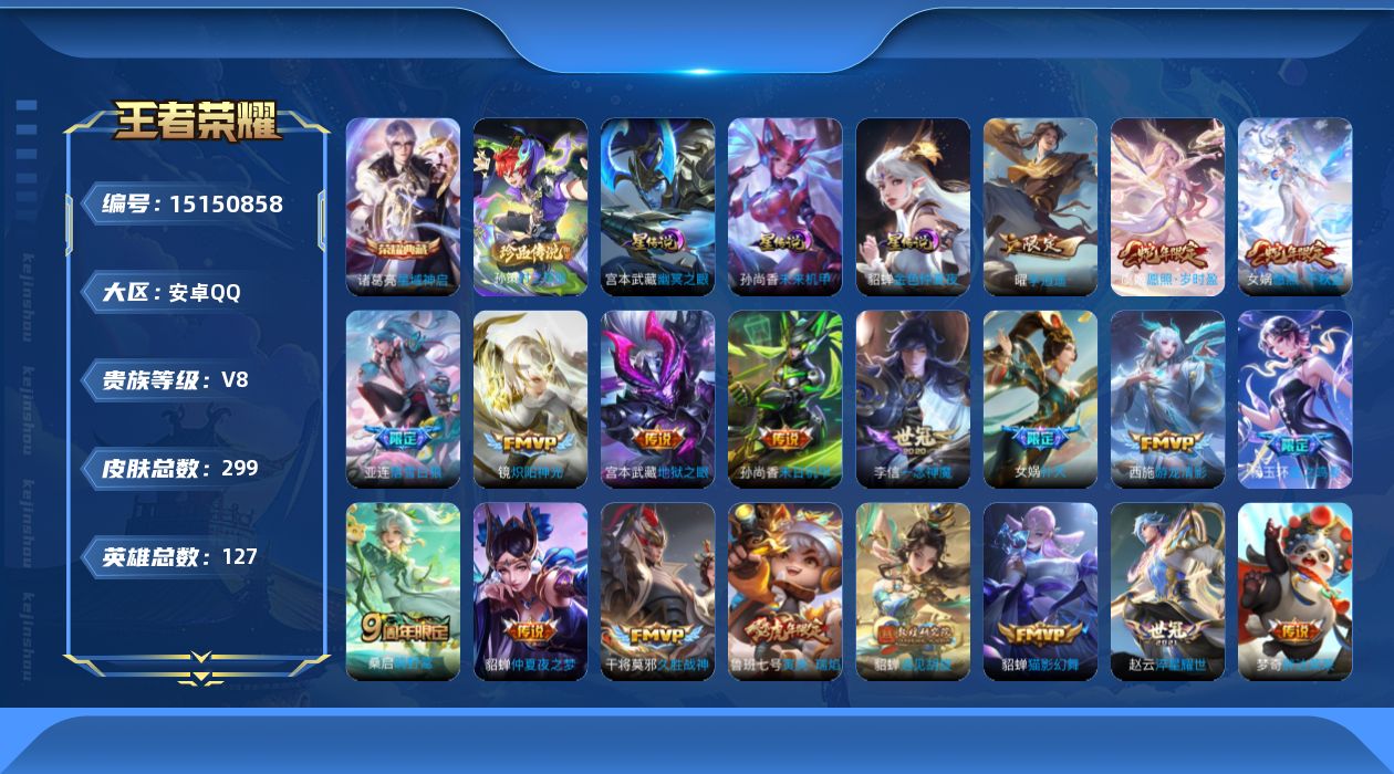 [15150858]【店主推荐捡漏号!可直接换绑】安卓Q-V8-最强王者段位-127英雄-299皮肤-1典藏皮肤-1珍品传说-24传说-90史诗