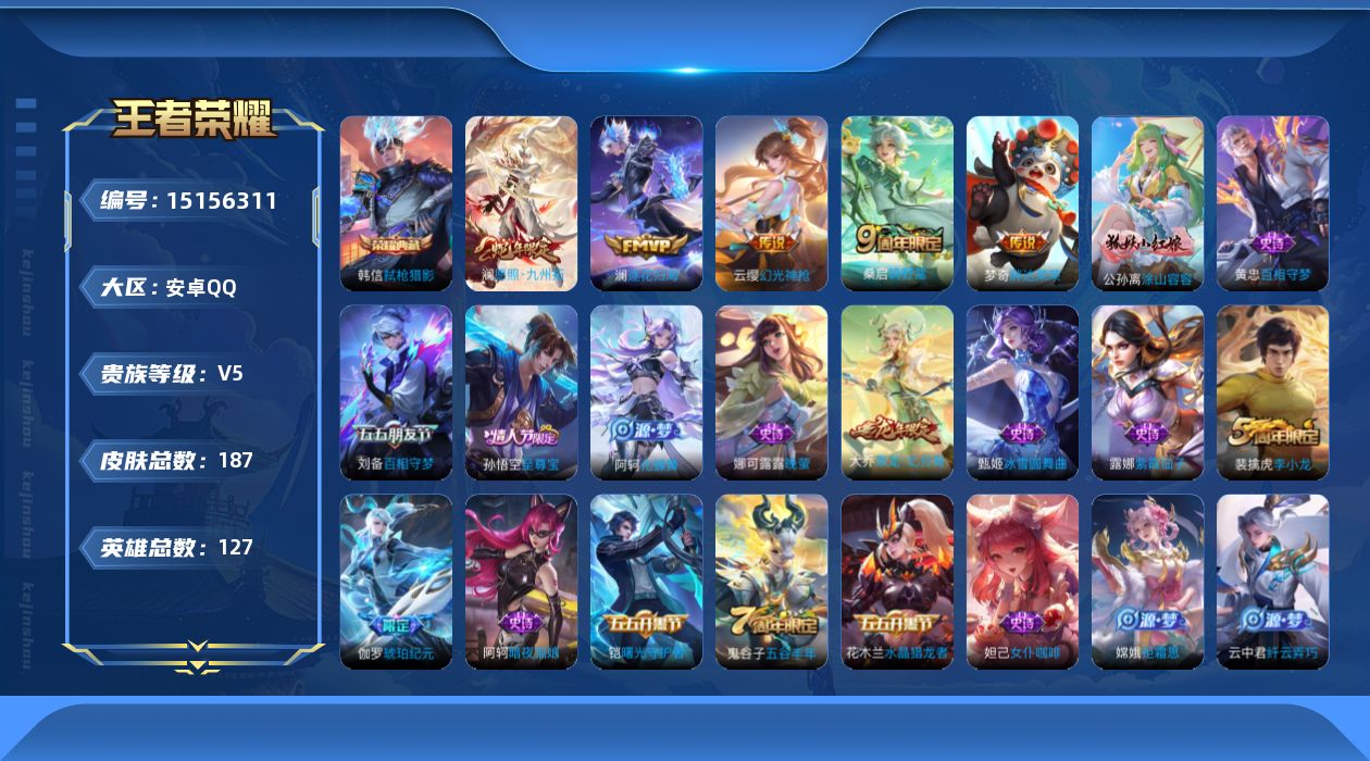 [15156311]可二次【店主推荐捡漏号!可直接换绑】安卓Q-V5-至尊星耀III段位-127英雄-187皮肤-1典藏皮肤-5传说-54史诗