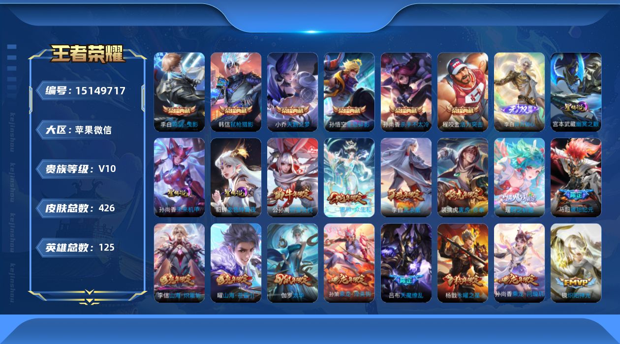 [15149717]苹果WX-V10-最强王者段位-125英雄-426皮肤-6典藏皮肤-1无双-56传说-136史诗-3星传说(幽冥之眼,未来机甲,金色仲夏夜)