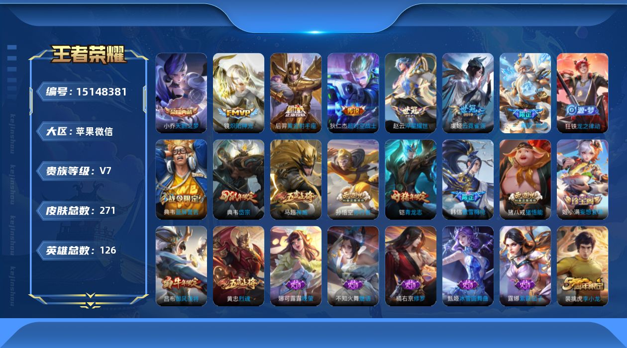[15148381]苹果WX-V7-至尊星耀II段位-126英雄-271皮肤-1典藏皮肤-5传说-62史诗