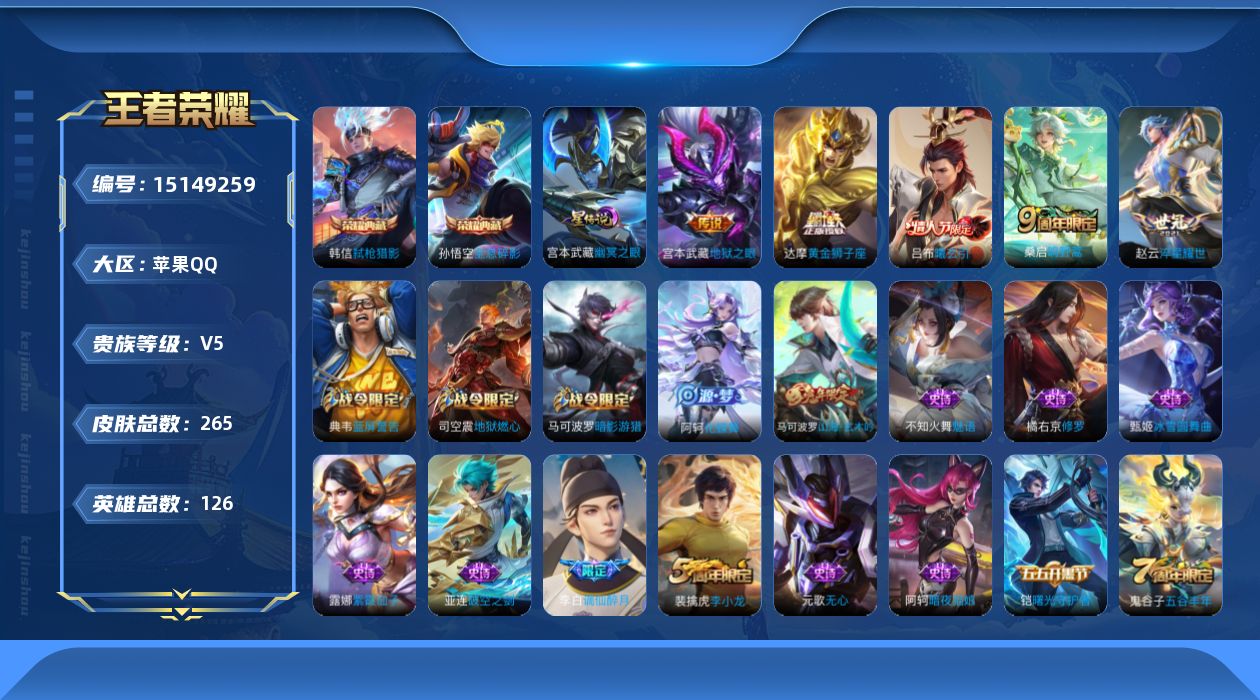 [15149259]可二次【店主推荐捡漏号!可直接换绑/六千二市50达摩/背包一颗荣耀水晶】:苹果Q-V7-至尊星耀III段位-126英雄-265皮肤-2典藏皮肤-6传说-1星元-72史诗
