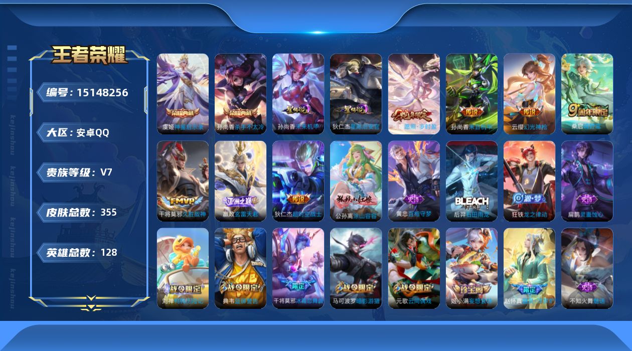 [15148256]【店主推荐捡漏号!可直接换绑】安卓Q-V7-最强王者段位-128英雄-355皮肤-2典藏皮肤-1典藏英雄-7传说-99史诗
