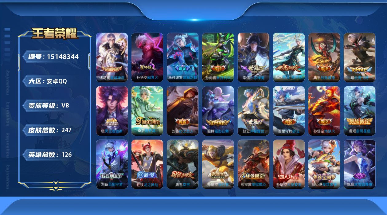 [15148344]可二次,【店主推荐捡漏号!可直接换绑】安卓Q-V8-最强王者段位-126英雄-247皮肤-1典藏皮肤-14传说-66史诗