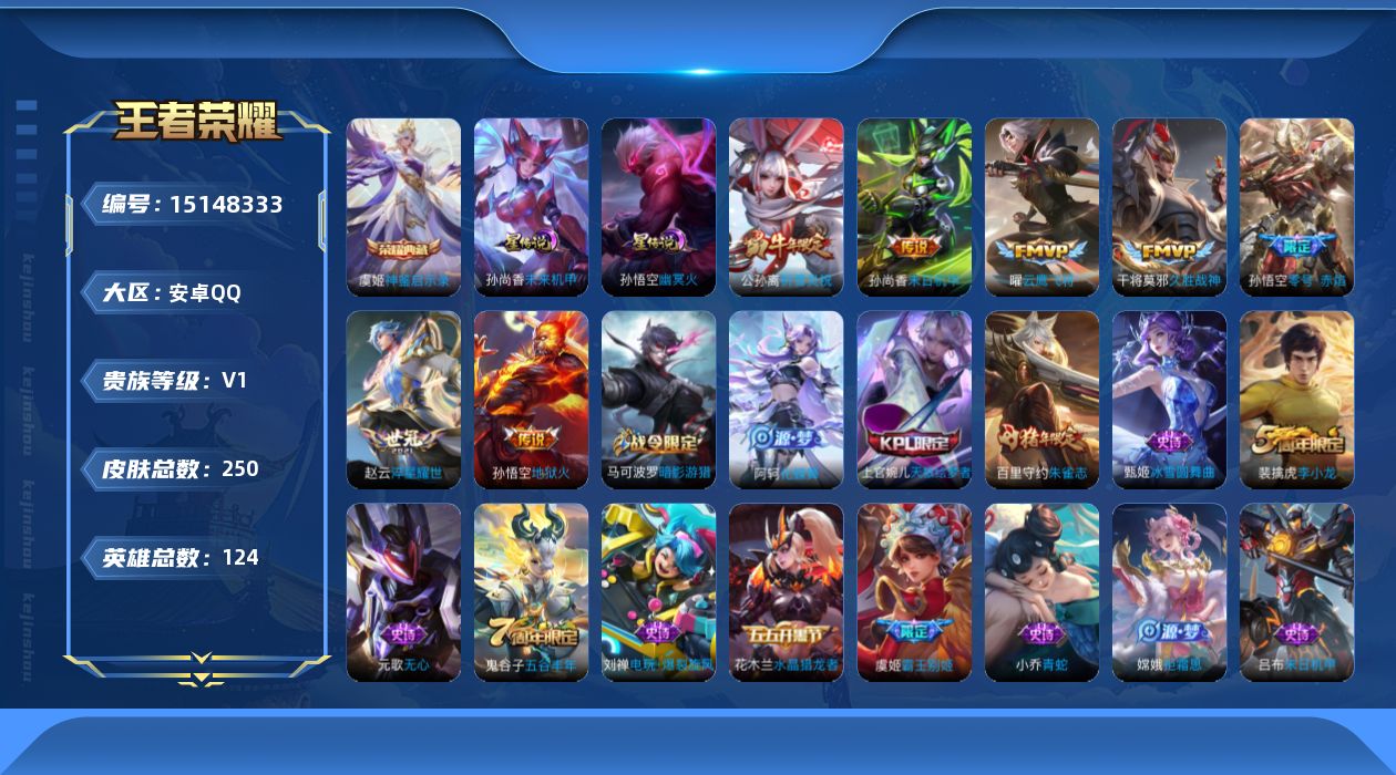 [15148333]可二次【店主推荐捡漏号!可直接换绑/5市标/4542星币可兑换星元皮肤】:安卓Q-V7-至尊星耀V段位-124英雄-250皮肤-1典藏皮肤-2星元-7传说-57史诗 【英雄全皮】:蒙恬全皮 【荣耀典藏】:虞姬神鉴启示录 【传说皮肤】:赵云淬星耀世,公孙离祈雪灵祝,孙悟空零号赤焰,曜云鹰飞将,干将莫邪久胜战神,孙尚香末日机甲,孙悟空地狱火 【限定皮肤】:白起狰,姜子牙天穹之誓,狄仁杰阴阳师,虞姬凯尔特女王,赵云皇家上将,墨子神迹守卫,嬴政白昼王子,孙尚香蔷薇恋人,庄周蜃楼王,庄周高山流水,高渐离死亡摇滚,高渐离玩趣恶龙,阿轲迷踪丽影,孙膑妖精王,扁鹊炼金王,芈月重明,吕布猎兽之王,元歌无心,夏侯惇朔风刀,甄姬游园惊梦,曹操烛龙,典韦穷奇,马可波罗暗影游猎,狄仁杰魔术师,狄仁杰万华元夜,达摩沙漠行僧,项羽海滩派对,老夫子醍醐杖,程咬金演武夺筹,刘邦夺宝奇兵,兰陵王金庭之子,孙悟空零号赤焰,牛魔御旌,后羿圣弓游侠,李元芳云中旅人,虞姬霸王别姬,钟馗驱傩正仪,杨玉环遇见飞天,女娲朔望之晖,干将莫邪真爱魔法,雅典娜单词大作战,雅典娜黎明之约,蔡文姬繁星吟游,太乙真人饕餮,鬼谷子原初探秘者,鬼谷子五谷丰年,苏烈千军破阵,百里玄策原初追逐者,百里守约朱雀志,弈星混沌棋,梦奇顽趣,公孙离祈雪灵祝,沈梦溪大漠名商,明世隐疑决卦,裴擒虎李小龙,裴擒虎擒涛扼浪,米莱狄御霄,云中君纤云弄巧,盾山御銮,猪八戒西部大镖客,上官婉儿梁祝,上官婉儿天狼绘梦者,嫦娥拒霜思,蒙犽狂想玩偶喵,鲁班大师探海日志,桑启海盐诗旅,阿古朵江河有灵,张良古海寻踪,蒙恬荣光圣徽,高渐离燃音魔法,妲己灵卜魔法,鬼谷子天穹祈灯,沈梦溪龙舞盛年,鲁班七号蔬乡物语,李元芳蔬乡物语,刘邦剑破天穹,程咬金群星魔术团,周瑜熔金海岸 【年限皮肤】:百里守约朱雀志,公孙离祈雪灵祝 【赛季限定】:庄周蜃楼王,孙膑妖精王,扁鹊炼金王,白起狰,芈月重明,夏侯惇朔风刀,曹操烛龙,典韦穷奇,狄仁杰万华元夜,达摩沙漠行僧,老夫子醍醐杖,程咬金演武夺筹,兰陵王金庭之子,张良古海寻踪,牛魔御旌,李元芳云中旅人,虞姬凯尔特女王,钟馗驱傩正仪,雅典娜黎明之约,太乙真人饕餮,鬼谷子原初探秘者,苏烈千军破阵,百里玄策原初追逐者,弈星混沌棋,梦奇顽趣,沈梦溪大漠名商,明世隐疑决卦,裴擒虎擒涛扼浪,米莱狄御霄,盾山御銮,鲁班大师探海日志,桑启海盐诗旅,鬼谷子