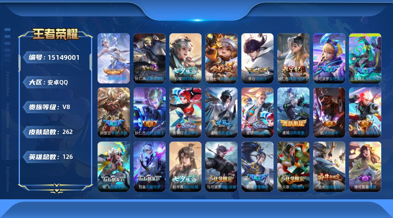 - [12151814]ak341-V8-263皮肤-1典藏-0无双-0珍品传说-15传说-75史诗 【荣耀典藏】:李白鸣剑曳影 【传说皮肤】:云缨幻光神枪,桑启鸣野蒿,孙悟空齐天大圣,李信山海炽霜斩,孙策末日机甲,裴擒虎寅虎赤拳,鲁班七号寅虎瑞焰,赵云淬星耀世,铠绛天战甲,镜炽阳神光,虞姬启明星使,干将莫邪久胜战神,达摩黄金狮子座,百里玄策白虎志,孙尚香末日机甲,狄仁杰超时空战士 【限定皮肤】:姜子牙天穹之誓,杨戬破阵退雄兵,狄仁杰阴阳师,赵云皇家上将,墨子神迹守卫,嬴政优雅恋人,孙尚香蔷薇恋人,鲁班七号寅虎瑞焰,庄周高山流水,高渐离死亡摇滚,高渐离玩趣恶龙,阿轲迷踪丽影,芈月幻夜卜梦,元歌云间偶戏,元歌无心,夏侯惇朔风刀,马可波罗逐梦之星,马可波罗暗影游猎,马可波罗山海玄木吟,狄仁杰魔术师,狄仁杰万华元夜,达摩星际陆战队,达摩沙漠行僧,项羽海滩派对,老夫子醍醐杖,老夫子航海奇遇记,关羽冰锋战神,程咬金演武夺筹,刘邦夺宝奇兵,韩信飞衡,韩信傲雪梅枪,兰陵王金庭之子,亚瑟潮玩骑士王,孙悟空至尊宝,孙悟空孙行者,孙悟空齐天大圣,后羿如梦令,后羿圣弓游侠,李元芳银河之约,李元芳云中旅人,虞姬启明星使,钟馗驱傩正仪,杨玉环遇见飞天,干将莫邪真爱魔法,雅典娜单词大作战,雅典娜黎明之约,鬼谷子原初探秘者,鬼谷子五谷丰年,黄忠火炮绅士,苏烈千军破阵,百里玄策白虎志,百里玄策原初追逐者,弈星混沌棋,梦奇顽趣,沈梦溪星空之诺,沈梦溪大漠名商,明世隐疑决卦,裴擒虎李小龙,裴擒虎寅虎赤拳,裴擒虎擒涛扼浪,米莱狄胡桃异想国,云中君纤云弄巧,云中君时之祈愿,李信山海炽霜斩,猪八戒西部大镖客,上官婉儿梁祝,上官婉儿天狼绘梦者,蒙犽狂想玩偶喵,鲁班大师探海日志,桑启海盐诗旅,艾琳女武神,艾琳流音漫舞,司空震地狱燃心,阿古朵江河有灵,张良古海寻踪,蒙犽百解令,蒙恬荣光圣徽,高渐离燃音魔法,妲己灵卜魔法,鬼谷子天穹祈灯,刘邦剑破天穹,周瑜熔金海岸 【年限皮肤】:百里玄策白虎志,裴擒虎寅虎赤拳,鲁班七号寅虎瑞焰,韩信飞衡,马超神威,马可波罗山海玄木吟,李信山海炽霜斩 【赛季限定】:夏侯惇朔风刀,狄仁杰万华元夜,达摩沙漠行僧,老夫子醍醐杖,程咬金演武夺筹,兰陵王金庭之子,张良古海寻踪,李元芳云中旅人,钟馗驱傩正仪,雅典娜黎明之约,鬼谷子原初探秘者,苏烈千军破阵,百里玄策原初追逐者,弈星混沌棋,梦奇顽趣,沈梦溪大漠名商,明世