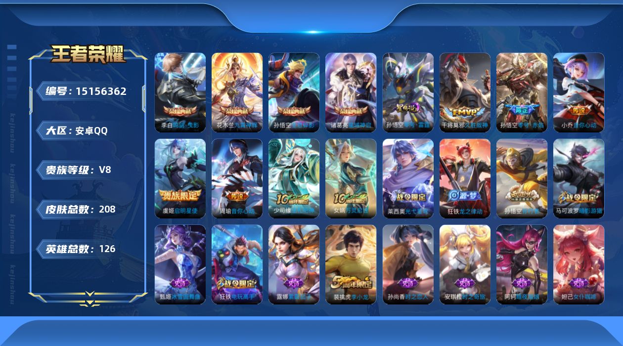 [15156362]【店主推荐捡漏号!可直接换绑】安卓Q-V8-至尊星耀III段位-126英雄-208皮肤-4典藏皮肤-5传说-46史诗 【荣耀典藏】:孙悟空全息碎影,李白鸣剑曳影,诸葛亮星域神启,花木兰九霄神辉 【传说皮肤】:周瑜音你心动,小乔音你心动,虞姬启明星使,孙悟空零号赤焰,干将莫邪久胜战神 【限定皮肤】:狄仁杰阴阳师,赵云皇家上将,赵云百木心枪,墨子神迹守卫,鲁班七号狮舞东方,白起夜都怪侠,芈月幻夜卜梦,吕布猎兽之王,周瑜赤莲之焰,夏侯惇朔风刀,甄姬落雪兰心,曹操烛龙,马可波罗暗影游猎,狄仁杰魔术师,狄仁杰万华元夜,达摩星际陆战队,达摩沙漠行僧,项羽海滩派对,老夫子醍醐杖,老夫子航海奇遇记,程咬金演武夺筹,刘邦夺宝奇兵,韩信逐梦之影,王昭君午后时光,兰陵王金庭之子,亚瑟潮玩骑士王,孙悟空零号赤焰,孙悟空孙行者,后羿圣弓游侠,李元芳云中旅人,虞姬启明星使,钟馗驱傩正仪,杨玉环遇见飞天,干将莫邪真爱魔法,雅典娜单词大作战,太乙真人饕餮,鬼谷子原初探秘者,黄忠火炮绅士,苏烈千军破阵,弈星混沌棋,沈梦溪大漠名商,明世隐疑决卦,明世隐吟游魔法,裴擒虎李小龙,裴擒虎擒涛扼浪,狂铁电玩高手,米莱狄胡桃异想国,猪八戒西部大镖客,上官婉儿梁祝,嫦娥拒霜思,蒙犽狂想玩偶喵,鲁班大师探海日志,桑启海盐诗旅,艾琳流音漫舞,张良古海寻踪,妲己灵卜魔法,鬼谷子天穹祈灯 【赛季限定】:夏侯惇朔风刀,曹操烛龙,狄仁杰万华元夜,达摩沙漠行僧,老夫子醍醐杖,程咬金演武夺筹,兰陵王金庭之子,张良古海寻踪,李元芳云中旅人,钟馗驱傩正仪,太乙真人饕餮,鬼谷子原初探秘者,苏烈千军破阵,弈星混沌棋,沈梦溪大漠名商,明世隐疑决卦,裴擒虎擒涛扼浪,鲁班大师探海日志,桑启海盐诗旅,鬼谷子天穹祈灯 【战令限定】:墨子神迹守卫,鲁班七号狮舞东方,白起夜都怪侠,芈月幻夜卜梦,吕布猎兽之王,周瑜赤莲之焰,甄姬落雪兰心,马可波罗暗影游猎,达摩星际陆战队,老夫子航海奇遇记,刘邦夺宝奇兵,王昭君午后时光,艾琳流音漫舞,亚瑟潮玩骑士王,后羿圣弓游侠,干将莫邪真爱魔法,雅典娜单词大作战,黄忠火炮绅士,明世隐吟游魔法,狂铁电玩高手,米莱狄胡桃异想国,猪八戒西部大镖客,蒙犽狂想玩偶喵,妲己灵卜魔法 【史诗皮肤】:露娜紫霞仙子,阿轲暗夜猫娘,赵云皇家上将,甄姬冰雪圆舞曲,王昭君偶像歌手,狄仁杰魔术师,宫本武藏鬼剑武藏,孙尚香水果甜心,嬴政摇滚巨星