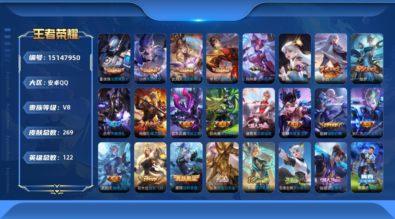 [15147950]可二次【店主推荐捡漏号!可直接换绑 中路26段】安卓Q-V8-最强王者段位-122英雄-269皮肤-4典藏皮肤-1典藏英雄-15传说-2星传说-73史诗 【荣耀典藏】:武则天英雄,武则天倪克斯神谕,夏侯惇无限飓风号,小乔天鹅之梦,芈月大秦宣太后 【传说皮肤】:后羿神树通天,虞姬启明星使,伽罗太华,貂蝉猫影幻舞,张良黄金白羊座,花木兰冠军飞将,杨戬永曜之星,诸葛亮武陵仙君,貂蝉仲夏夜之梦,李白凤求凰,孙尚香末日机甲,宫本武藏地狱之眼,吕布天魔缭乱,武则天海洋之心,狄仁杰超时空战士 【限定皮肤】:白起狰,狄仁杰阴阳师,小乔纯白花嫁,虞姬凯尔特女王,赵云皇家上将,赵云引擎之心,妲己热情桑巴,妲己时之彼端,嬴政优雅恋人,嬴政白昼王子,鲁班七号狮舞东方,庄周云端筑梦师,高渐离死亡摇滚,阿轲迷踪丽影,钟无艳王者之锤,扁鹊炼金王,芈月重明,吕布天魔缭乱,吕布猎兽之王,周瑜真爱至上,周瑜赤莲之焰,夏侯惇朔风刀,甄姬游园惊梦,曹操烛龙,典韦穷奇,典韦蓝屏警告,马可波罗逐梦之星,狄仁杰魔术师,狄仁杰万华元夜,达摩沙漠行僧,项羽海滩派对,老夫子圣诞老人,老夫子醍醐杖,貂蝉逐梦之音,安琪拉魔法小厨娘,程咬金演武夺筹,露娜一生所爱,刘邦夺宝奇兵,王昭君凤凰于飞,兰陵王驯魔猎人,兰陵王金庭之子,花木兰青春决赛季,孙悟空至尊宝,孙悟空大圣娶亲,牛魔御旌,后羿辉光之辰,李元芳银河之约,虞姬霸王别姬,虞姬启明星使,钟馗神迹守卫,钟馗驱傩正仪,杨玉环遇见飞天,杨戬永曜之星,女娲朔望之晖,干将莫邪冰霜恋舞曲,蔡文姬奇迹圣诞,蔡文姬繁星吟游,太乙真人饕餮,太乙真人华丽摇滚,东皇太一逐梦之光,鬼谷子原初探秘者,诸葛亮武陵仙君,百里玄策原初追逐者,弈星混沌棋,公孙离蜜橘之夏,沈梦溪星空之诺,沈梦溪大漠名商,明世隐疑决卦,裴擒虎李小龙,狂铁御狮,米莱狄御霄,伽罗太华,盾山御銮,上官婉儿梁祝,嫦娥如梦令,鲁班大师探海日志,桑启海盐诗旅,裴擒虎梅西,沈梦溪龙舞盛年 【年限皮肤】:王昭君凤凰于飞,李白凤求凰,杨戬永曜之星,后羿辉光之辰,伽罗太华 【赛季限定】:扁鹊炼金王,白起狰,芈月重明,夏侯惇朔风刀,曹操烛龙,典韦穷奇,狄仁杰万华元夜,达摩沙漠行僧,老夫子醍醐杖,程咬金演武夺筹,兰陵王金庭之子,牛魔御旌,虞姬凯尔特女王,钟馗驱傩正仪,太乙真人饕餮,鬼谷子原初探秘者,百里玄策原初追逐者,弈星混沌棋,沈梦溪大漠名商