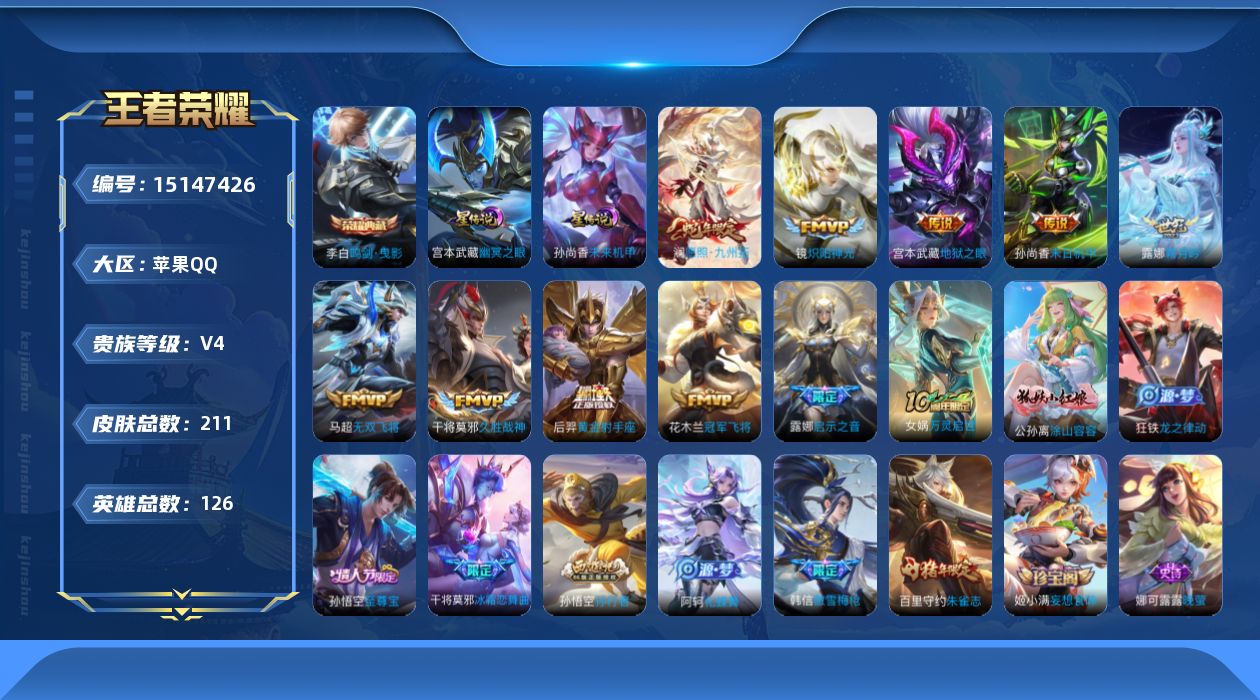 [15147426]【店主推荐捡漏号!可直接换绑/3770星币可兑换星元皮肤/1省标/7市标/34段打野】:苹果Q-V7-最强王者段位-126英雄-211皮肤-1典藏皮肤-2星元-12传说-55史诗