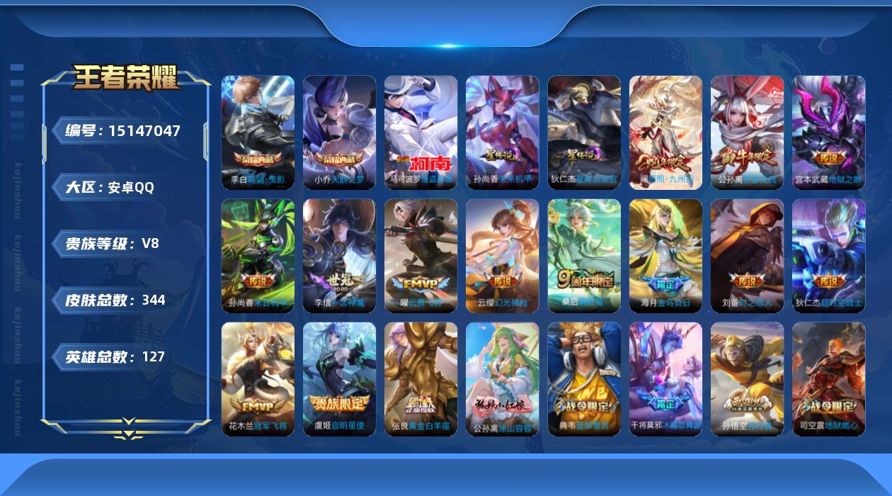 [15147047]可二次【店主推荐捡漏号!可直接换绑/1省标/5市标/48段对抗/33段发育/3981星币可兑换星元皮肤】:安卓Q-V8-最强王者段位-127英雄-344皮肤-2典藏皮肤-1珍品传说-3星元-15传说-99史诗