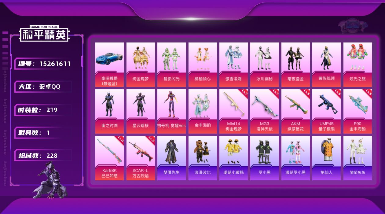 [15261611]暑期末清货/特价急出/永久包赔安卓 手Q-12粉装-7特效枪-1载具-8.4w热力值-10印记-219套装-228枪皮【热门品类】:绝对防御上衣【稀有载具】:幽澜尊爵(静谧蓝)【特效枪等级】:AKM-绿萝繁花(五级),SCAR-L-万古烈焰(三级),UMP45-量子极限(五级),P90-金丰海韵(五级),Kar98K-巳巳如意(四级),Mini14-绚金瑰梦(七级),MG3-洛神天依(七级)【优质套装】:粉装-绚金瑰梦,粉装-碧影闪光,粉装-橘柚倾心,粉装-傲雪凌霜,粉装-冰川幽秘,粉装-暗夜鎏金,粉装-黄族统领,粉装-炫光之旅,角色-宙之时溯,角色-星云暗核,角色-初号机 觉醒Ver.,粉装-金丰海韵【优质飞行器】:绒雪飘舞飞行器,黄族统领飞行器