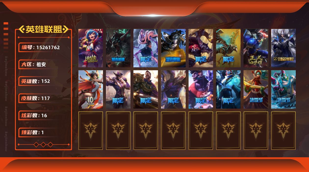 [15261762][店主推荐捡漏号]白银段位-152英雄-117皮肤-16炫彩-0终极-1神话-16限定-9传说-37史诗