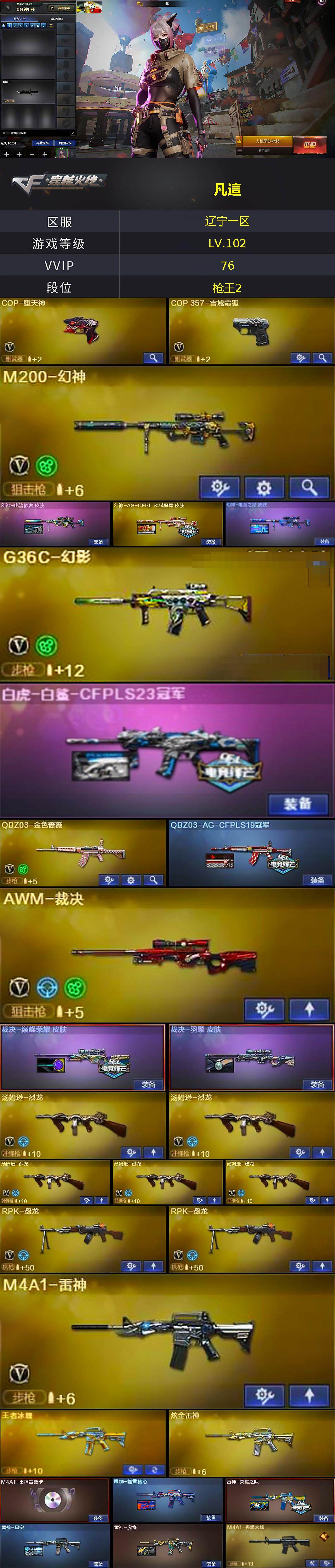 【皮肤】:幻神-电流骇客 皮肤,幻神-AG-CFPL S24冠军 皮肤,幻神-电竞之星 皮肤,白虎-白鲨-CFPLS23冠军,QBZ03-AG-CFPLS19冠军,裁决-巅峰荣耀 皮肤,裁决-羽掣 皮肤,雷神-能量核心,雷神-荣耀之魄,雷神-星空,雷神-虎将,M4A1-再燃火线,火麒麟-冠军之心,火麒麟-巅峰荣耀,黑龙-能量核心,黑骑士-地狱火,AK47-黑武士-361,战神-紫绶金章皮肤*2,战神-流金岁月皮肤*3,AWM-天龙-传奇白鲨,修罗-能量核心,屠龙-荣耀之锋,龙啸-巅峰荣耀 皮肤,轻型军用手斧-再燃火线