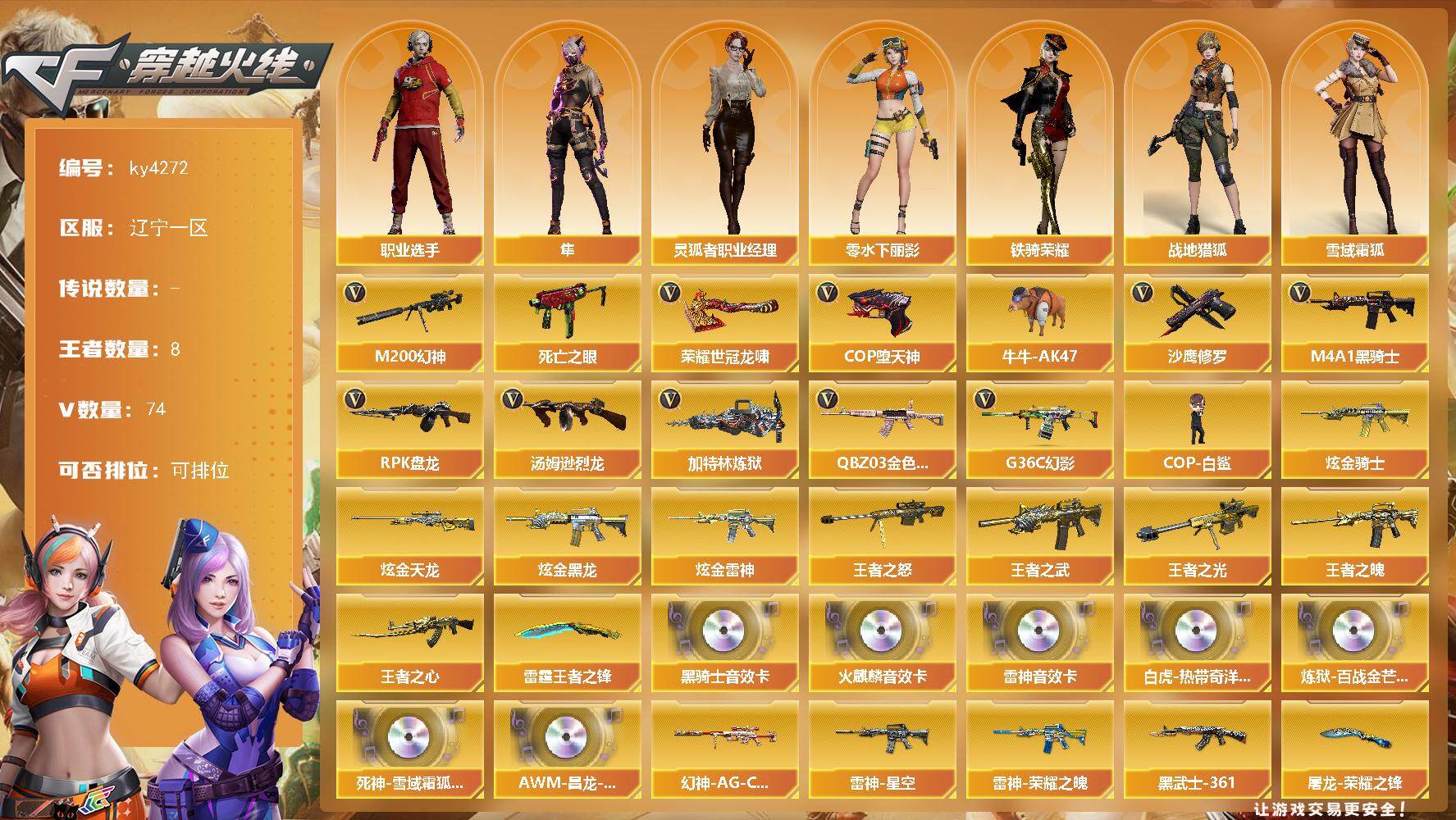 [15246974]辽宁一区-74V-8王者-5炫金 【热门武器】:G36C-幻影,QBZ03-金色蔷薇,M200-幻神,死亡之眼,牛牛-AK47,M4A1-黑骑士,汤姆逊-烈龙*5,RPK-盘龙*2,加特林-炼狱*2,COP-白鲨,COP-堕天神,沙鹰-修罗*4,荣耀世冠-龙啸 【王者炫金武器】:王者之武,王者之魄,王者之心,王者之光,王者之怒,雷霆王者之锋,炫金骑士*2,炫金黑龙,炫金雷神,炫金天龙 【音效卡】:Scar Light-白虎-热带奇洋音效卡,AK47-火麒麟音效卡,M4A1-雷神音效卡,M4A1-黑骑士音效卡,炼狱-百战金芒-庆典舞曲音效卡,死神-雪域霜狐-怀旧音效卡,AWM-昌龙-怀旧音效卡 【皮肤】:幻神-电流骇客 皮肤,幻神-AG-CFPL S24冠军 皮肤,幻神-电竞之星 皮肤,白虎-白鲨-CFPLS23冠军,QBZ03-AG-CFPLS19冠军,裁决-巅峰荣耀 皮肤,裁决-羽掣 皮肤,雷神-能量核心,雷神-荣耀之魄,雷神-星空,雷神-虎将,M4A1-再燃火线,火麒麟-冠军之心,火麒麟-巅峰荣耀,黑龙-能量核心,黑骑士-地狱火,AK47-黑武士-361,战神-紫绶金章皮肤*2,战神-流金岁月皮肤*3,AWM-天龙-传奇白鲨,修罗-能量核心,屠龙-荣耀之锋,龙啸-巅峰荣耀 皮肤,轻型军用手斧-再燃火线 【角色】:隼,战地猎狐,雪域霜狐,乔伊教练,修道士,云海玲珑,空,芳心审判者,嘉年华灵狐,零-水下丽影,灵狐者-职业经理,蛇姬,铁骑荣耀,新娜塔莎,职业选手 【人偶武器】:COP-白鲨,AWM-灵狐-15周年嘉年华,牛牛-AK47,迷你牛牛,生化手雷-机甲核心,闪光弹-小乔,迷你超能女侍 【暴走生化】:死亡之眼 【挑战大师】:阐释者III 【英雄级武器】:M4A1-千变,AK47-火麒麟,M4A1-黑龙,M4A1-雷神,M4A1-黑骑士,M4A1-死神,AK47-黑武士,AK12-天启,AN94-超新星,AK47-机械迷城,G36C-幻影,死神-雪域霜狐,QBZ03-金色蔷薇,王者之势-觉醒版,黑骑士-海王,AWM-天龙,Barrett-毁灭,Barrett-极光,AWM-裁决,M200-幻神,RPK-盘龙*2,加特林-炼狱*2,炼狱-百战金芒,汤姆逊-烈龙*5,AA-12-雷霆,沙鹰-修罗*4,沙鹰-天神*2,COP-堕天神,COP 357-雪域霜狐,屠龙*4