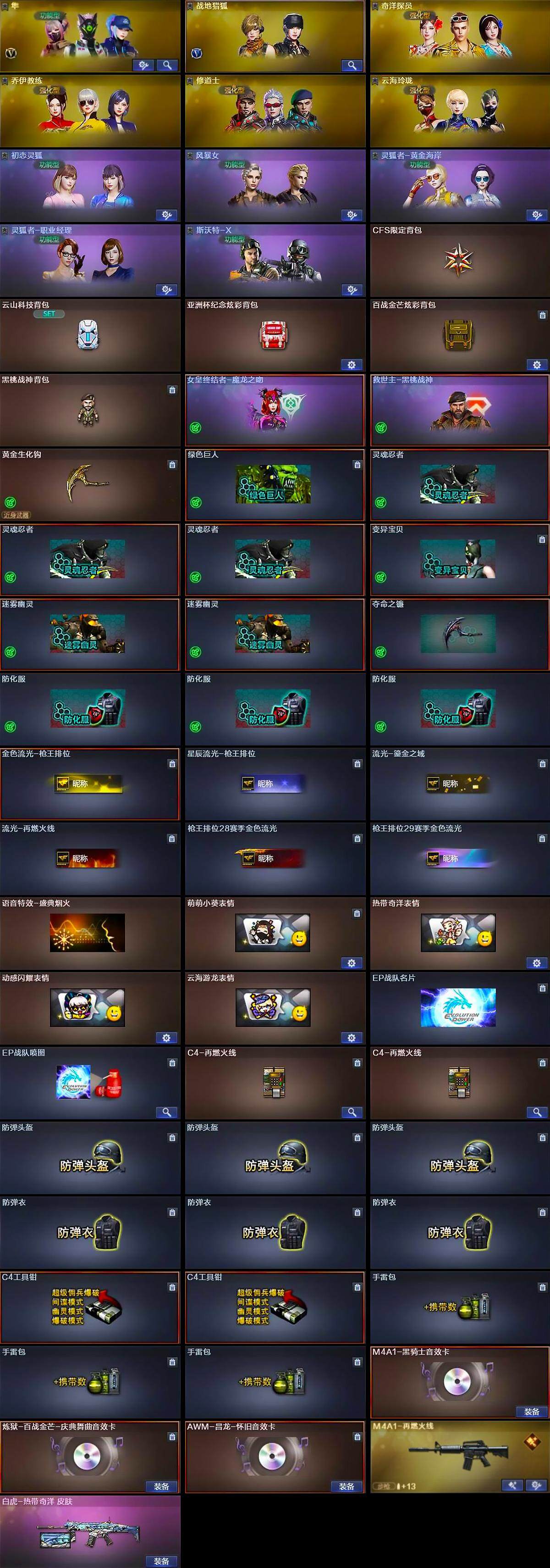 【道具】:CFS限定背包,云山科技背包,亚洲杯纪念炫彩背包,百战金芒炫彩背包,黑桃战神背包,女皇终结者-魔龙之吻,救世主-黑桃战神,黄金生化钩,绿色巨人,灵魂忍者*3,变异宝贝,迷雾幽灵*2,夺命之镰,防化服*3,金色流光-枪王排位,星辰流光-枪王排位,流光-鎏金之域,流光-再燃火线,枪王排位28赛季金色流光,枪王排位29赛季金色流光,语音特效-盛典烟火,萌萌小葵表情,热带奇洋表情,动感闪耀表情,云海游龙表情,EP战队名片,EP战队喷图,C4-再燃火线*2,防弹头盔*3,防弹衣*3,C4工具钳*2,手雷包*3